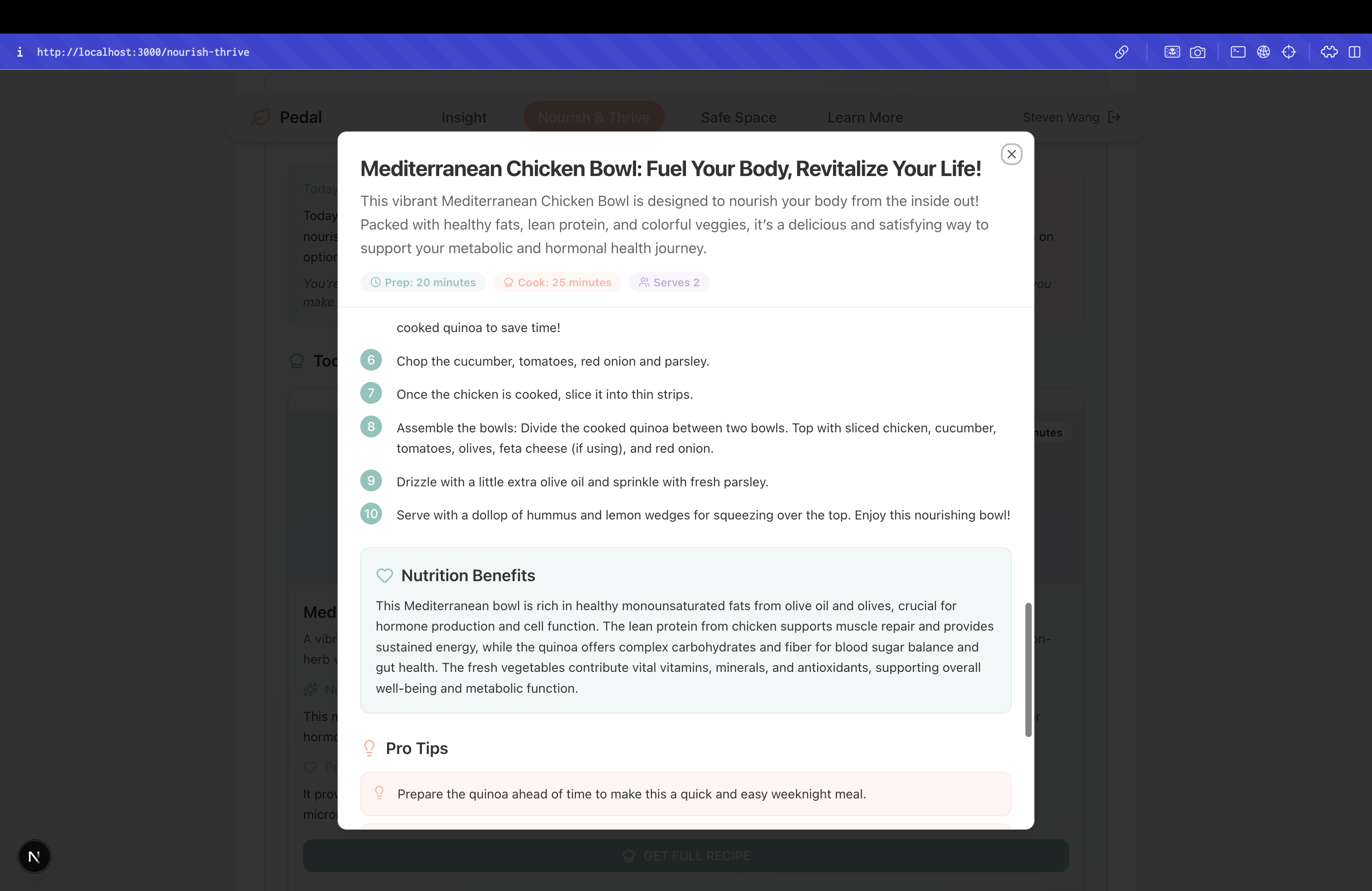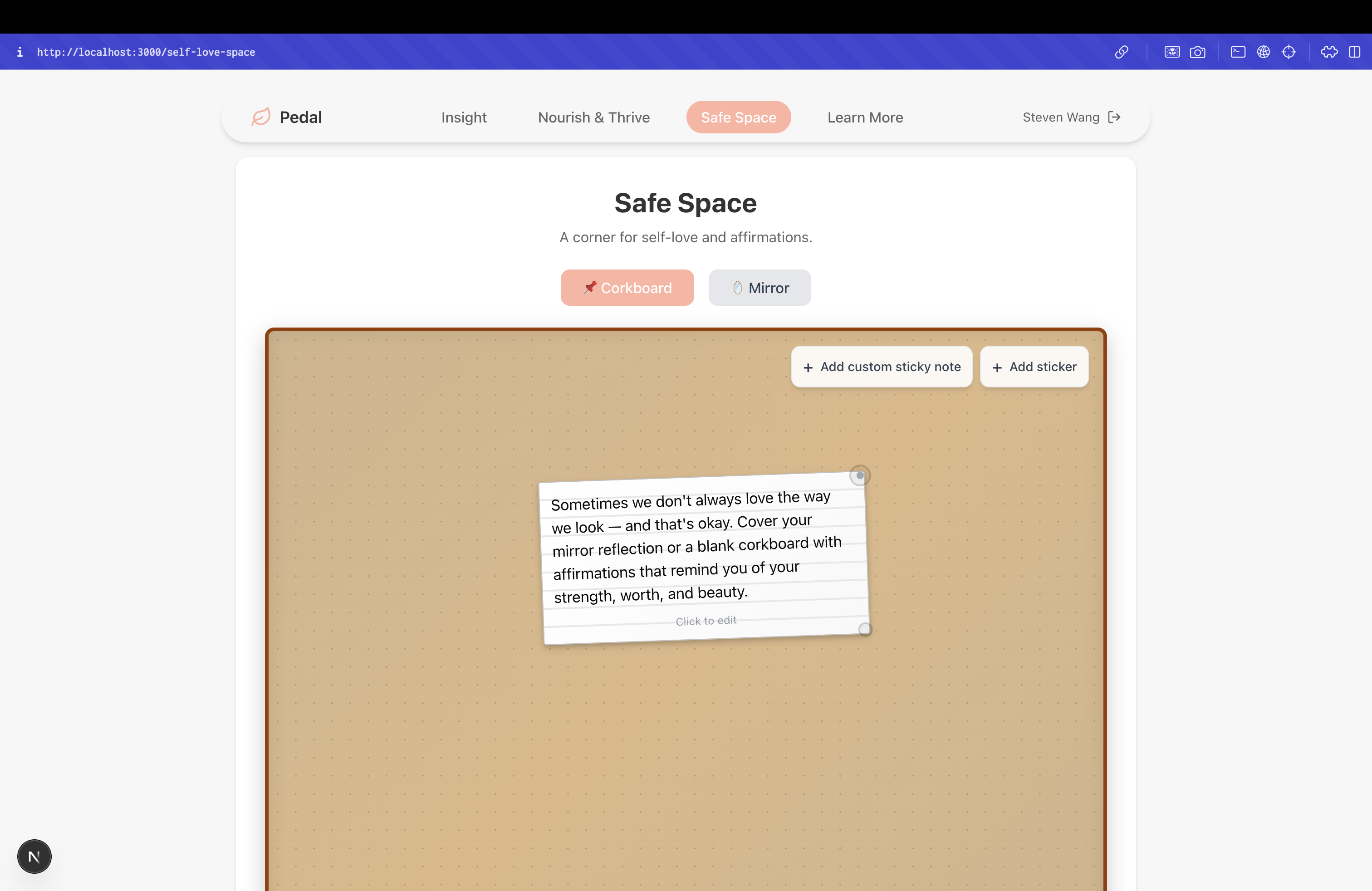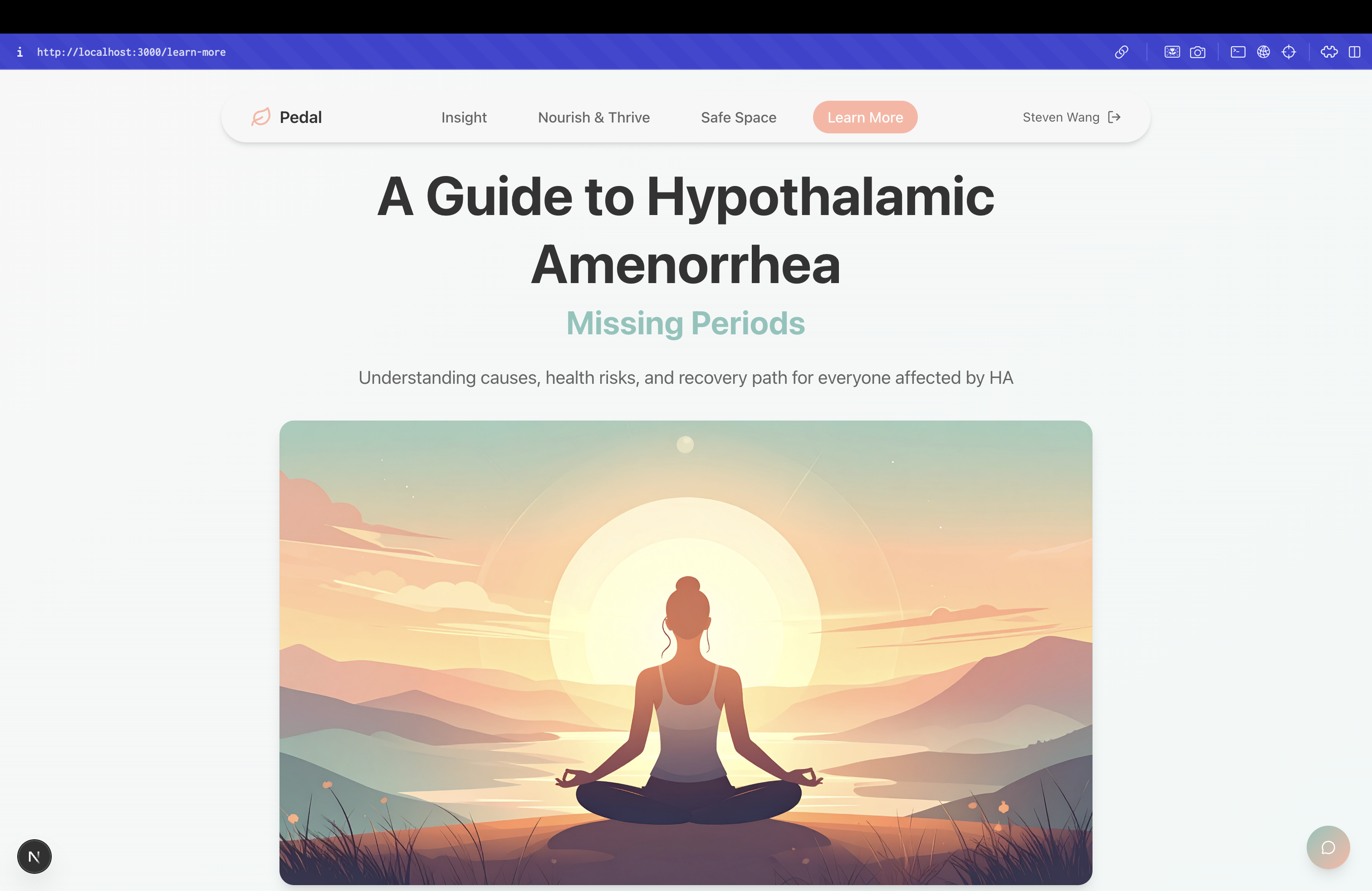 The inspiration for Pedal comes from Karen Cao’s personal journey with hypothalamic amenorrhea (HA). During recovery, she struggled deeply with her mental health. She often turned to health and fitness apps for support, only to find many were harmful rather than helpful—promoting unhealthy habits and even contributing to the mindset that led to her diagnosis. This project is her way of creating the safe, supportive resource she needed during her journey.
