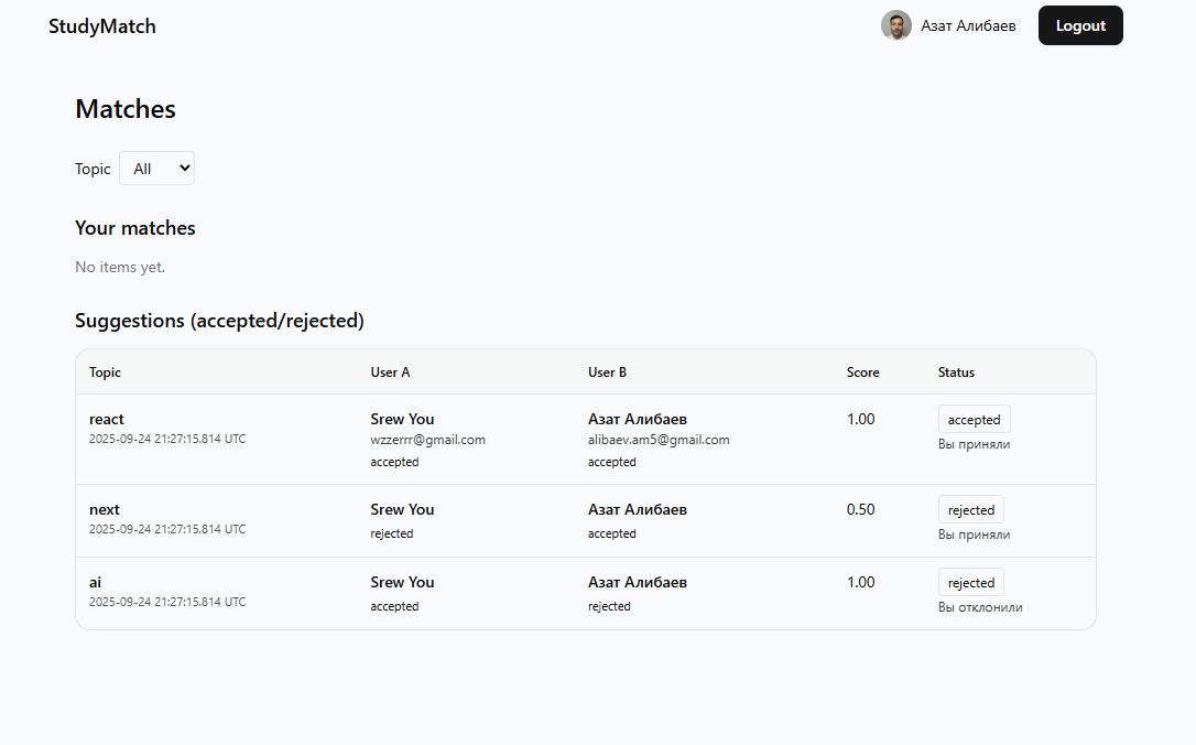Finding a serious study partner is mostly luck and spam. We wanted a tiny, calm tool that proposes peers by shared topics and compatible levels, with an explainable score instead of black-box “magic.”