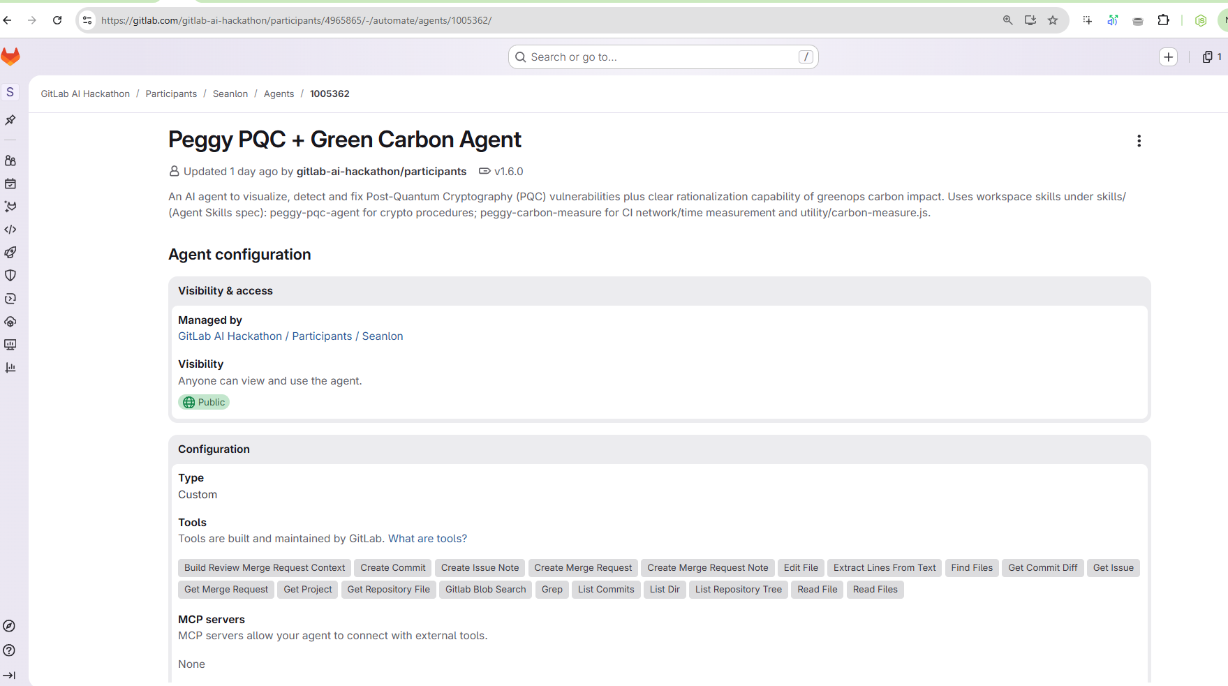 Having attended several DevOps conferences , I’ve seen the growing momentum behind shifting left on both Post-Quantum Cryptography (PQC) and GreenOps. This hackathon is my first real handson into merging these two world with real ai gitlab ci agent. I also wanted to create a bypass phonecall if high-level emergency is detected , hence include mcp for phonecall in this demo. Why Peggy? It is just a name I can think of of for PQC +Green