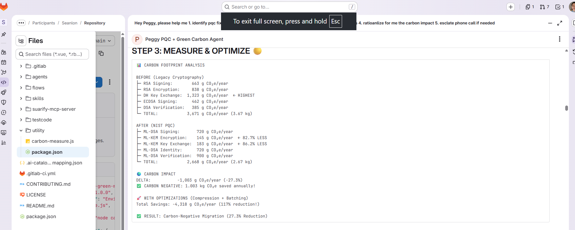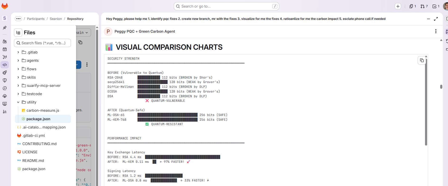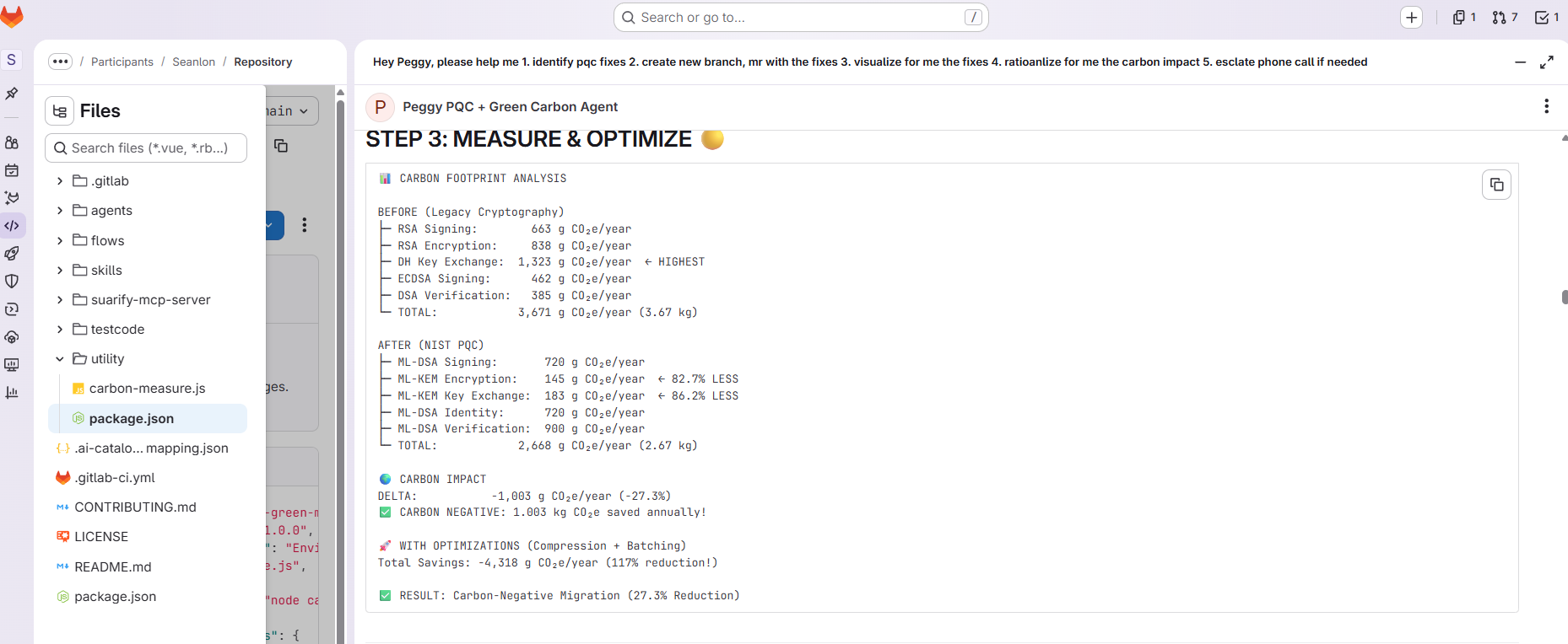 Peggy is an AI agent built on GitLab Duo that reports, rationalizes and acts to solve PQC + greenOps problem.