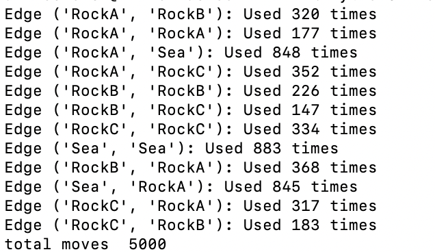 We modeled the rocky nests as nodes and the trails as edges and used the networkx library to create a graph of the environment. We used a Markov chain model to track the probability that a penguin would stay on its node, leave for another node, or leave for the sea. We ran the simulation using simpy on 50 penguins for 100 time steps and outputted the results using Matplotlib.