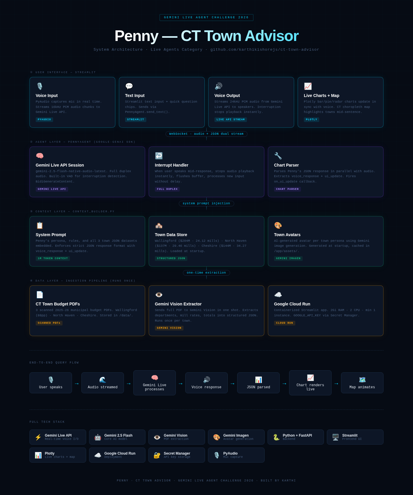 I'm proud that Penny never hallucinates every number she cites is pulled directly from real 2025-26 municipal budget documents. The interruption handling feels genuinely live users can cut Penny off mid-sentence and she pivots instantly without any awkward pause. I'm also proud of the end-to-end multimodal experience: voice in, voice out, charts rendering in sync, and a live CT map animating as towns are mentioned all working together seamlessly. Deployed and live on Google Cloud Run within 3 days.