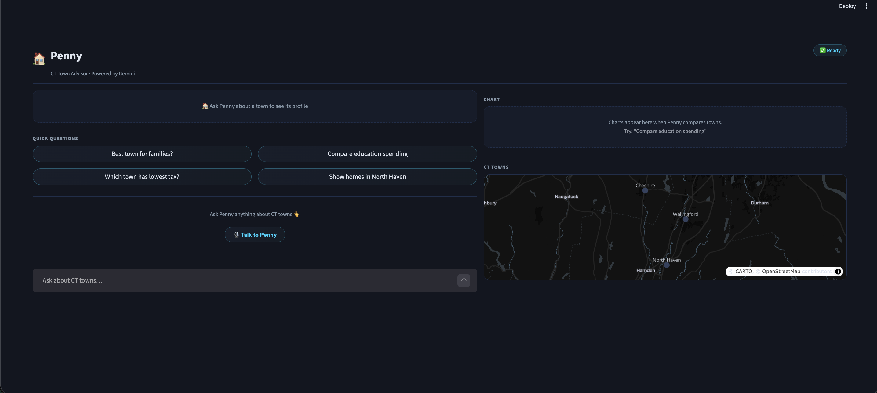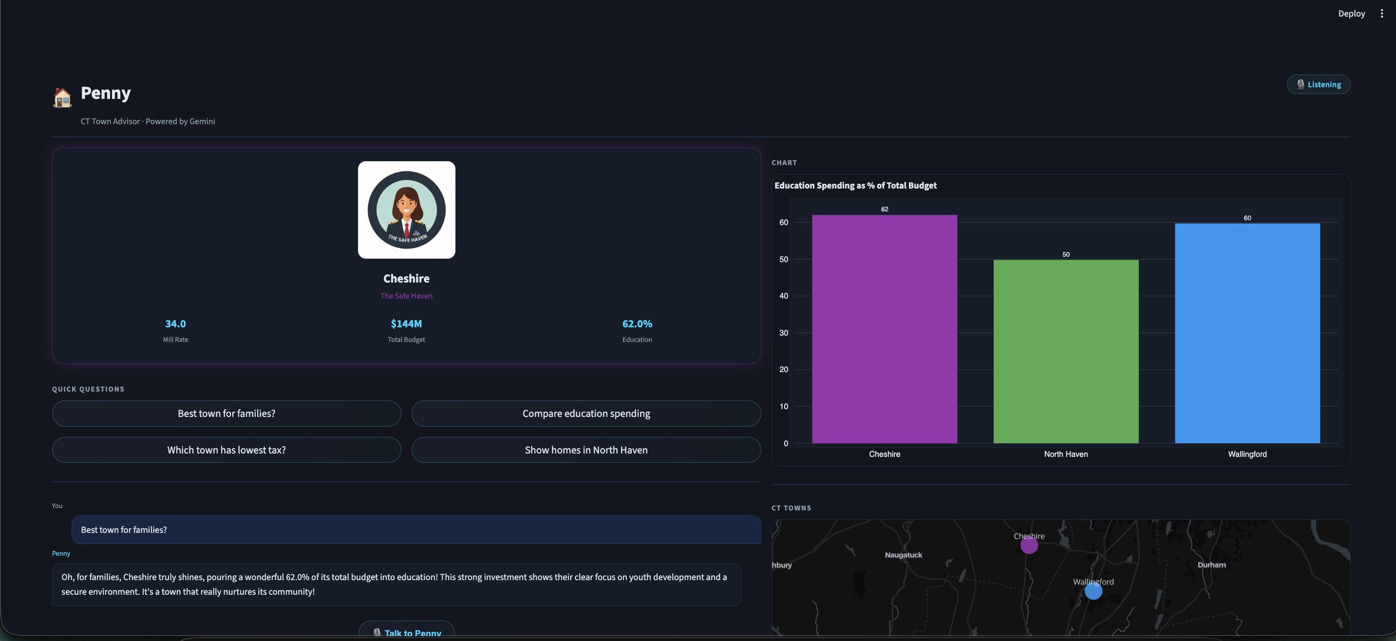 Penny is a real-time voice AI advisor that helps Connecticut residents compare towns. Users speak naturally to Penny, who responds instantly in voice while simultaneously rendering interactive charts and highlighting towns on a live CT map. Penny covers Wallingford, North Haven, and Cheshire each with a unique persona and answers questions like "Which town has the lowest tax?", "Compare education spending", or "What's my annual tax on a $500k home?" Penny can be interrupted mid-sentence and pivots instantly, making the conversation feel genuinely live and natural.