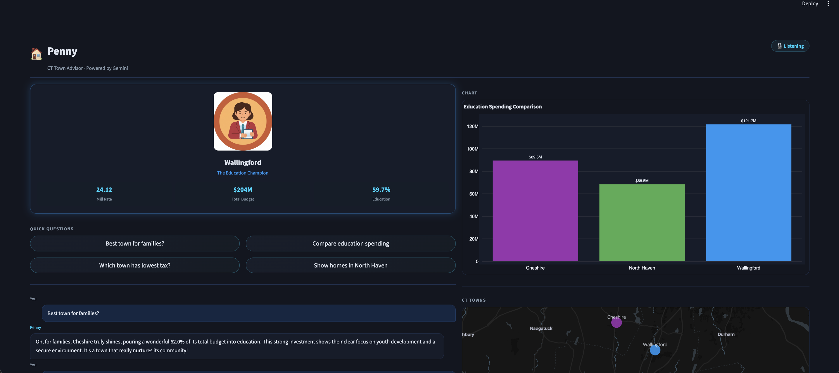 Moving is one of the most stressful decisions people make. Yet comparing Connecticut towns means downloading dense 100+ page scanned budget PDFs, cross-referencing spreadsheets and trying to make sense of mill rates and department allocations all without any guidance. I wanted to fix that. What if you could just ask out loud "Is Wallingford good for my family?" and get a warm, honest, data-backed answer in seconds?