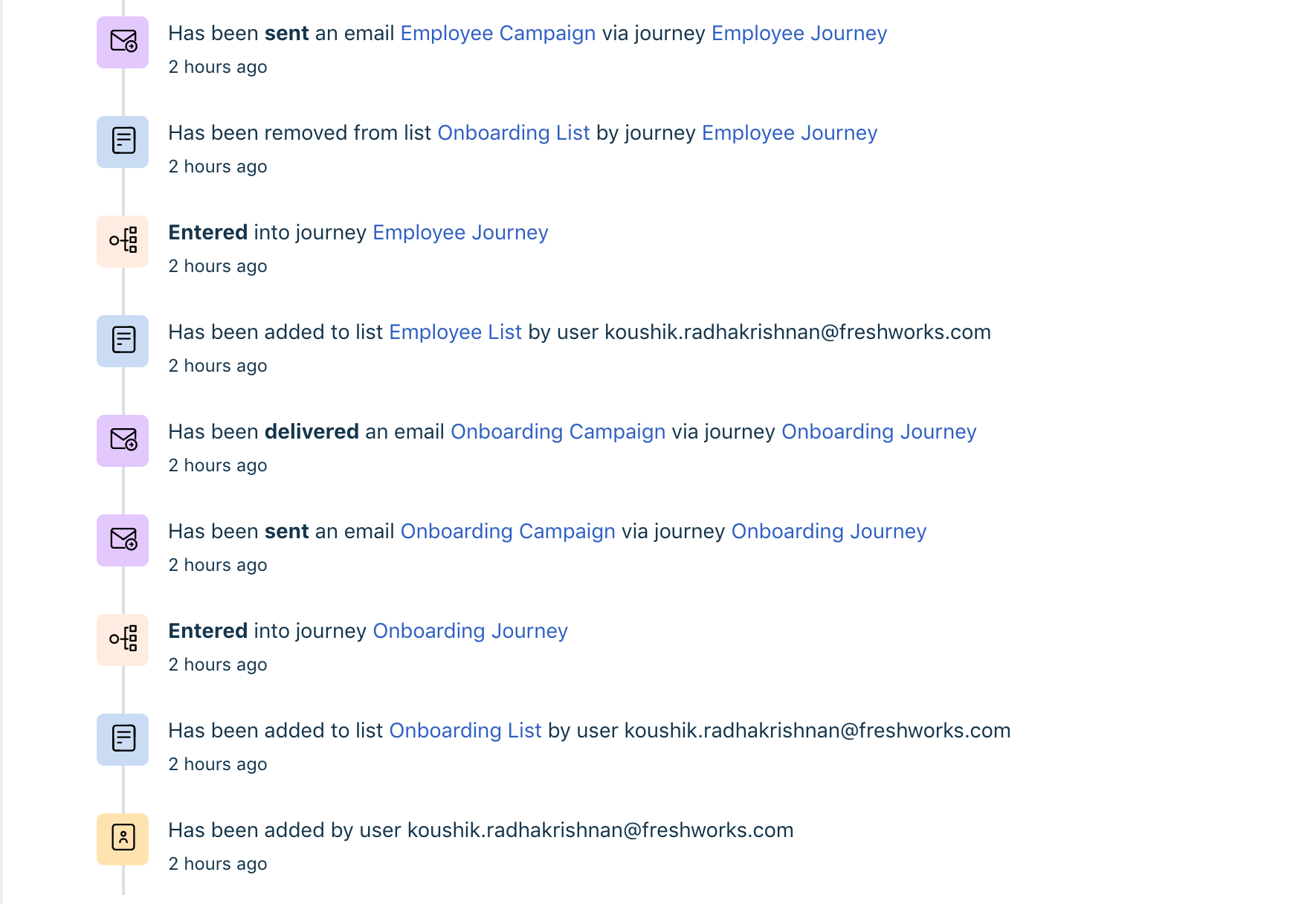 3) Automated grouping of employees based on your field preferences and with one touch fields sync between Freshteam and FreshMarketer. Send automated campaigns or events based on employee groups.