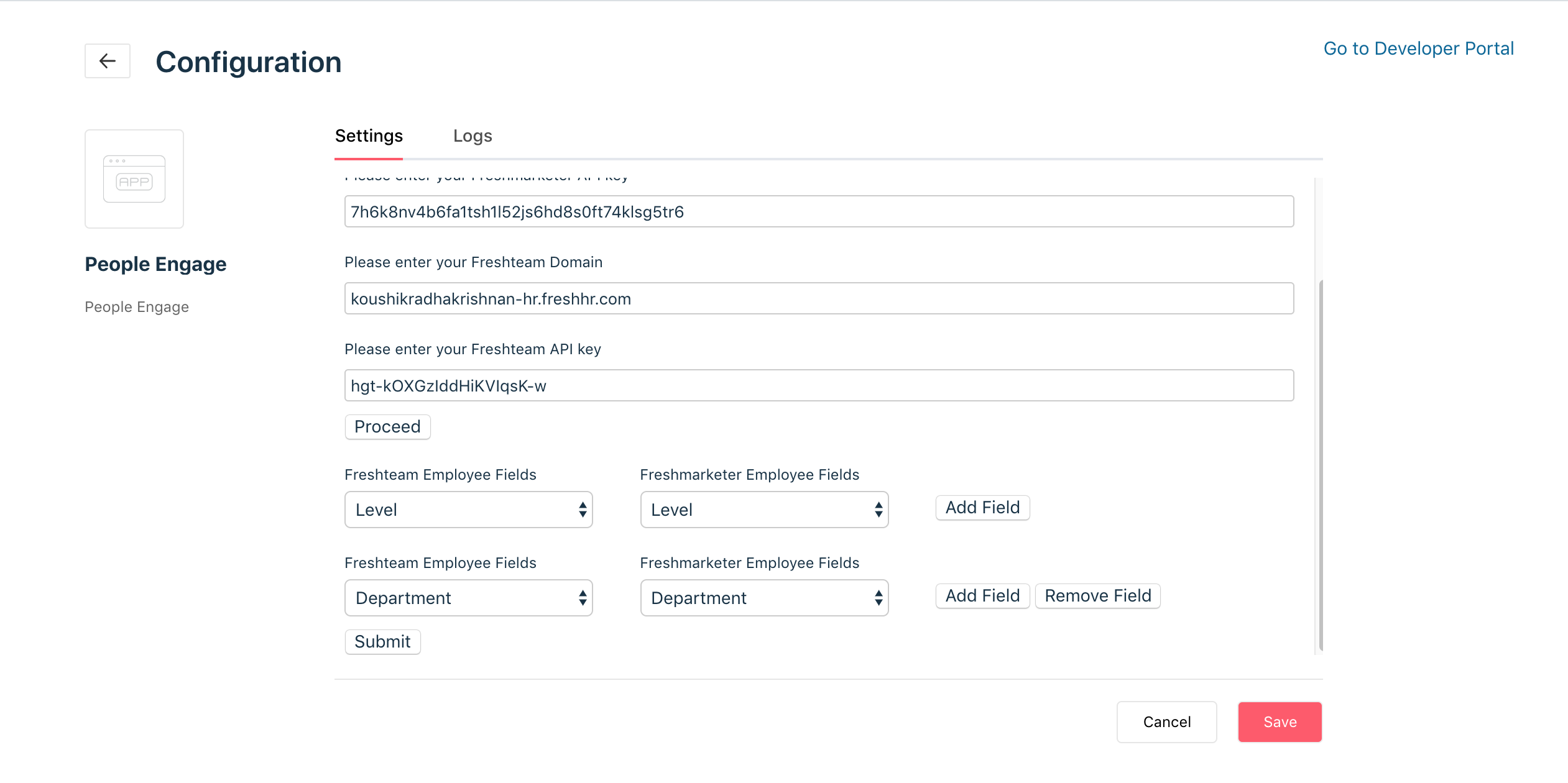 5) Click "Proceed" under your settings to Map the Fields to sync with your Freshteam and Freshmarketer. If you don't want to map any fields. Click "Skip and Submit" to proceed further.