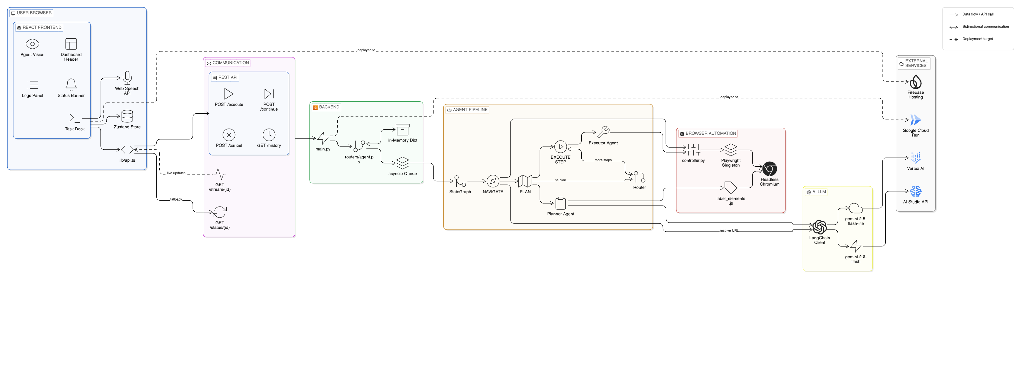 Real-time Feedback: Keeping the user updated during a 10-step task was hard. I implemented a Dual-Stream architecture: SSE for task logs and WebSockets for live JPEG frames of the browser, ensuring the user is never in the dark.
