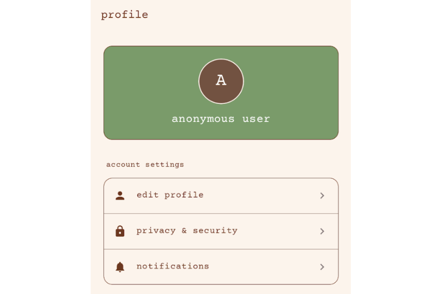 calming ui/ux: Designed with a deeply organic, earthy color palette (sage greens, warm browns, and creams) and minimalist typewriter typography to reduce sensory overload and anxiety.