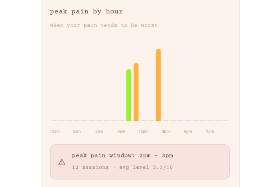 mindful logging: Easily log or edit manual pain sessions and menstrual cycles. Track start and end times, peak pain levels (1-10), specific symptoms (cramping, fatigue, nausea), private journal notes, and menstrual flow.