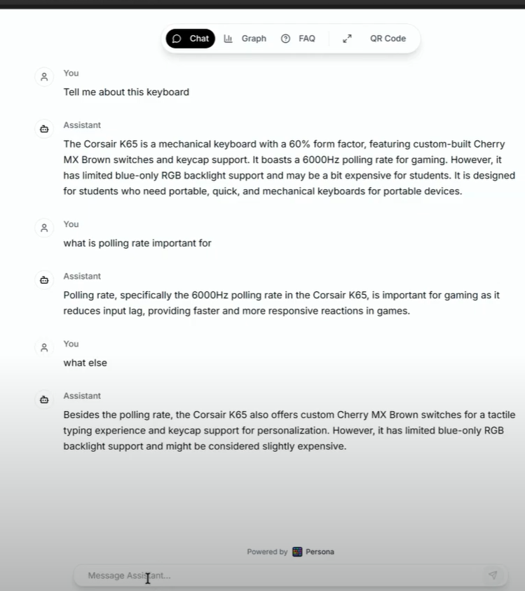 Persona contextualizes product data like docs, product guides, and help content into a smart, AI-powered assistant. It cleans, structures, and connects the data using force graphs and visual workflows. The result? Your users get context-aware answers and guided interactions, reducing confusion and increasing engagement.