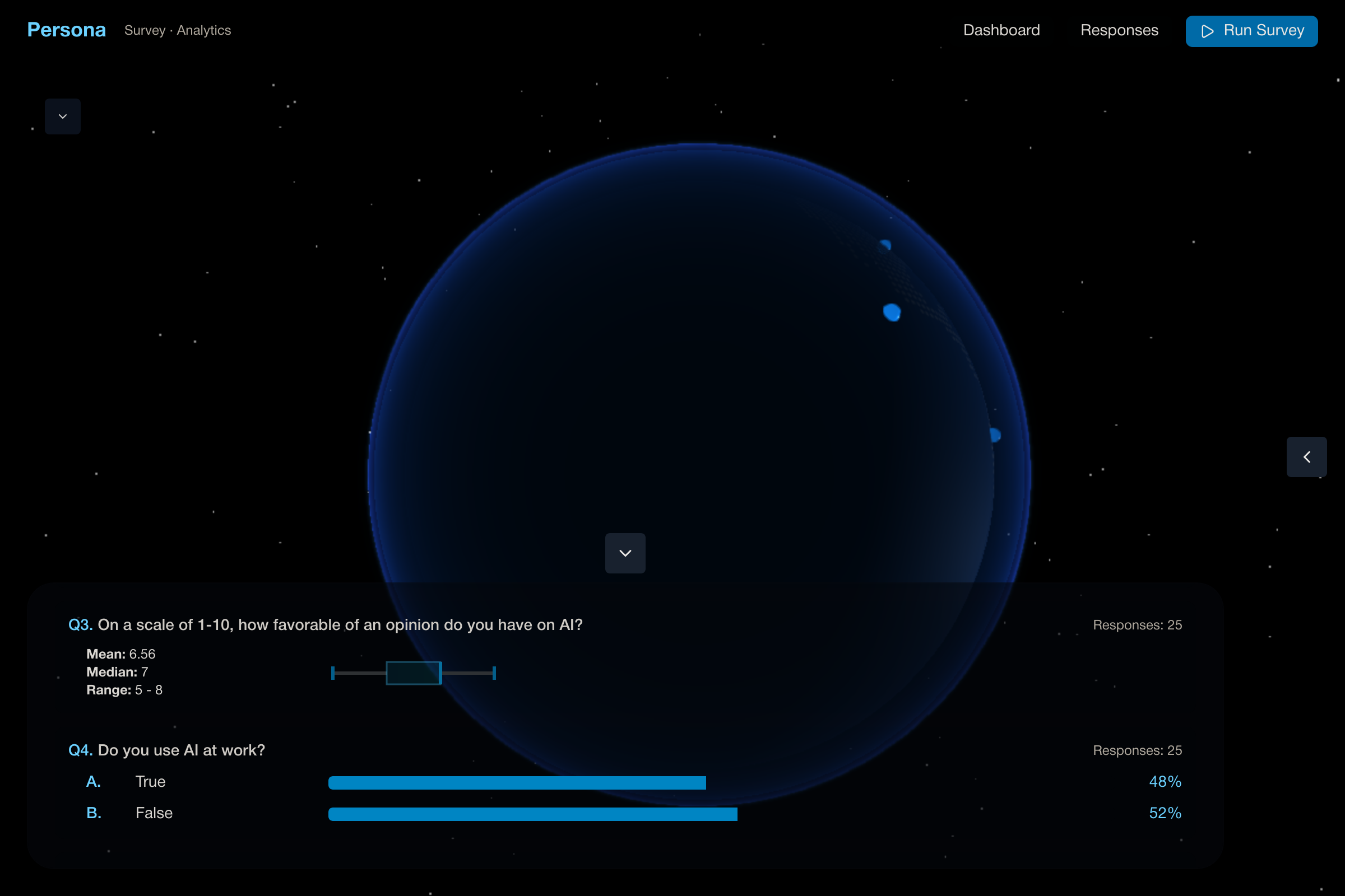 Despite the technical hurdles, the 3D interactive globe looks awesome. I wanted to implement an atmosphere haze and a Karman line glow that would immerse you in the data. I successfully built the core experience: generating personas, collecting survey responses, and visually exploring results in a single interface. It was my first project connecting a UI to an n8n-powered backend workflow, and the initial integration came together shockingly fast. I've used GitHub Copilot for years but I had yet to try Agents until this weekend. This was also my first hackathon where I went well past the 12-hour mark!