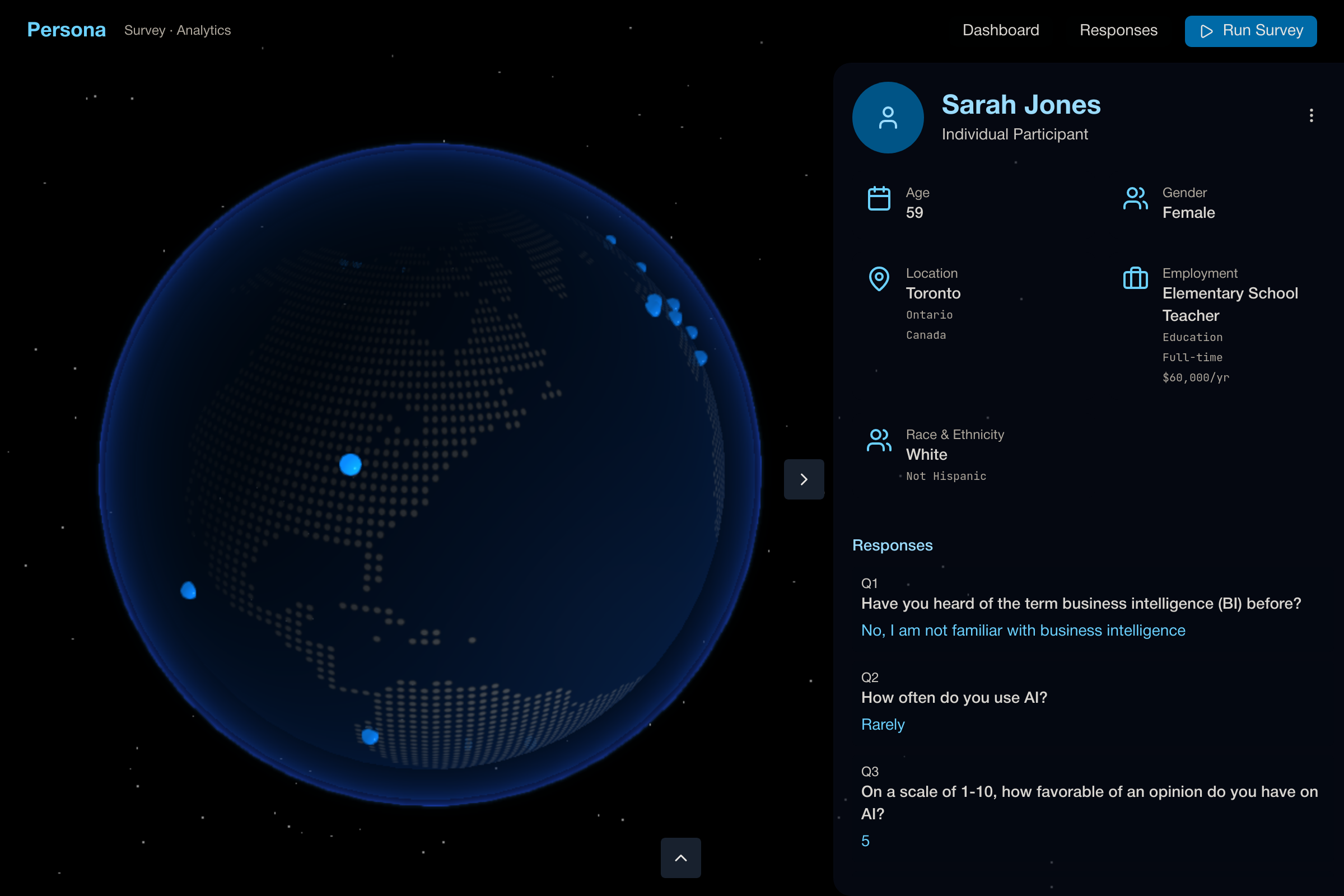 n8n was used to easily automate the backend that would interface with LLM providers. Its a relatively straightforward visual coding tool but this introduced complexity. The lack of shared LLM memory across concurrent threads meant that personas had to be generated sequentially with careful cross-run context, otherwise the model repeated the same persona over and over again. On the UI side, building a 3D globe was far from trivial. My limited experience with Three.js and shader work made atmospheric effects, point mapping, and interaction design much harder than anticipated. Additionally, since this was a solo project, every bug, every design choice, every technical misstep landed on me alone.