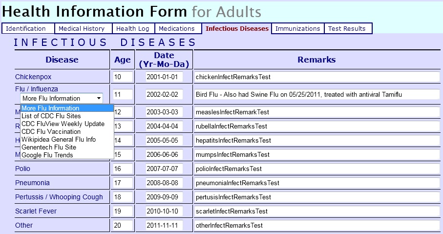 The MediRec Personal Health Record ( PHR ) web site at www.medirec.us is a free-to-use, non-profit site that has an "Infectious Diseases" section / tab. The Flu record item in this section allows data entries ( it's the 2nd item down from the top of the Infectious Disease section), and this record contains a drop down selection of URLs that shows a selected site in place of the PHR. The list of Flu sites has several CDC sites, including the CDC Flu feed site listing many other Flu resource sites, and the CDC FluView site utilizing the weekly Flu Activity Report data. Several other prominent Influenza web sites can also be selected, including the Genentech FluFacts site, and the Wikipedia Flu site. To access the MediRec Flu information, it isn't necessary to set up a user account, as the default example account of the mythical user "Charles Guest" permits access to the Flu information in the same way that a real user has access. To use this application, go the site URL at www.medirec.us, and note that Internet Explorer browsers may show a popup message saying that you've logged in as user "Guest" - click "OK" to proceed. Click on the "Infectious Diseases" tab, go down to the "Flu" item, and click on the drop down box to select a site option. Selected sites appear in place of the PHR in the lower half of the screen, and you can return to the PHR with the browser "Back" button. A more extensive but less functional mockup site, currently without a database, is also available at www.medirec.org. The Flu entry can be accessed in a similar way to the database-backed prototype site at www.medirec.us. To see the mockup site, go to the URL at www.medirec.org, click on the "Medical History" tab, and then click the "Infectious Diseases" item, and you will see the same selection box of web sites as at www.medirec.us, under the Flu / Influenza item.