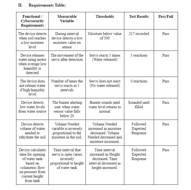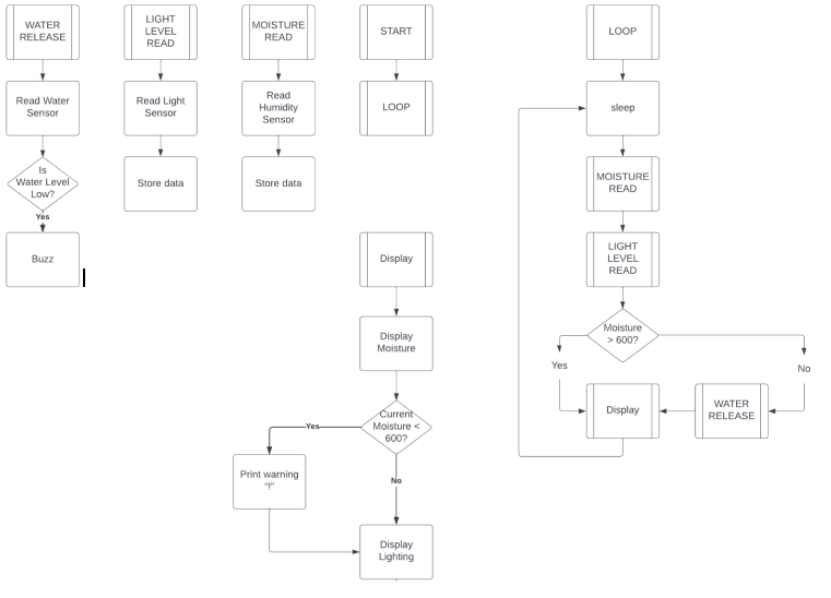 With two members of the team growing up on a farm, the subjects of the environment and human services both stood out to us. We wanted to develop a way for the environment to be monitored as well as provide a service to anyone using our project, whether commercial or personal. Plants and the soil used in said plant's life stood out to us as we examined the available sensors provided for this project. We thought of the water intake and watering cycles of plants to keep them healthy and how it can be hard for individuals to find time to water their plants when life gets in the way such as trips or work that can leave plants withering away. Our project was a way for struggling individuals to possibly have a small personal food source with a vegetable garden or for a larger scale commercial farm to have automatic systems in place to cover a large area of land.