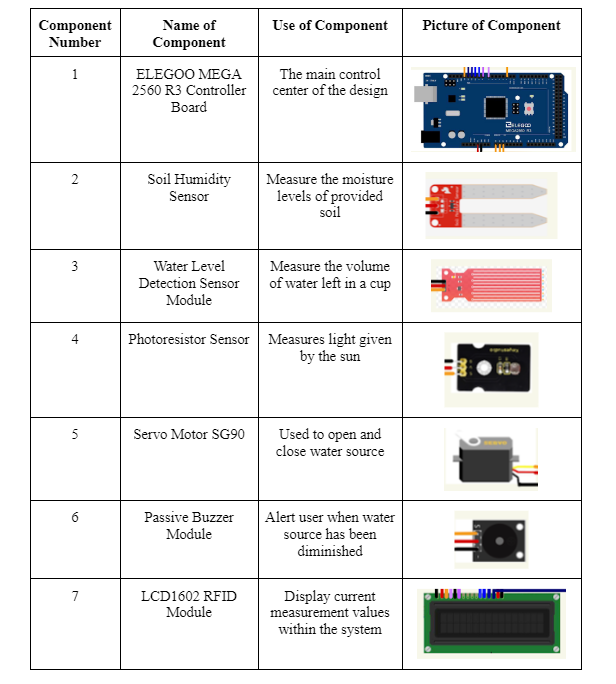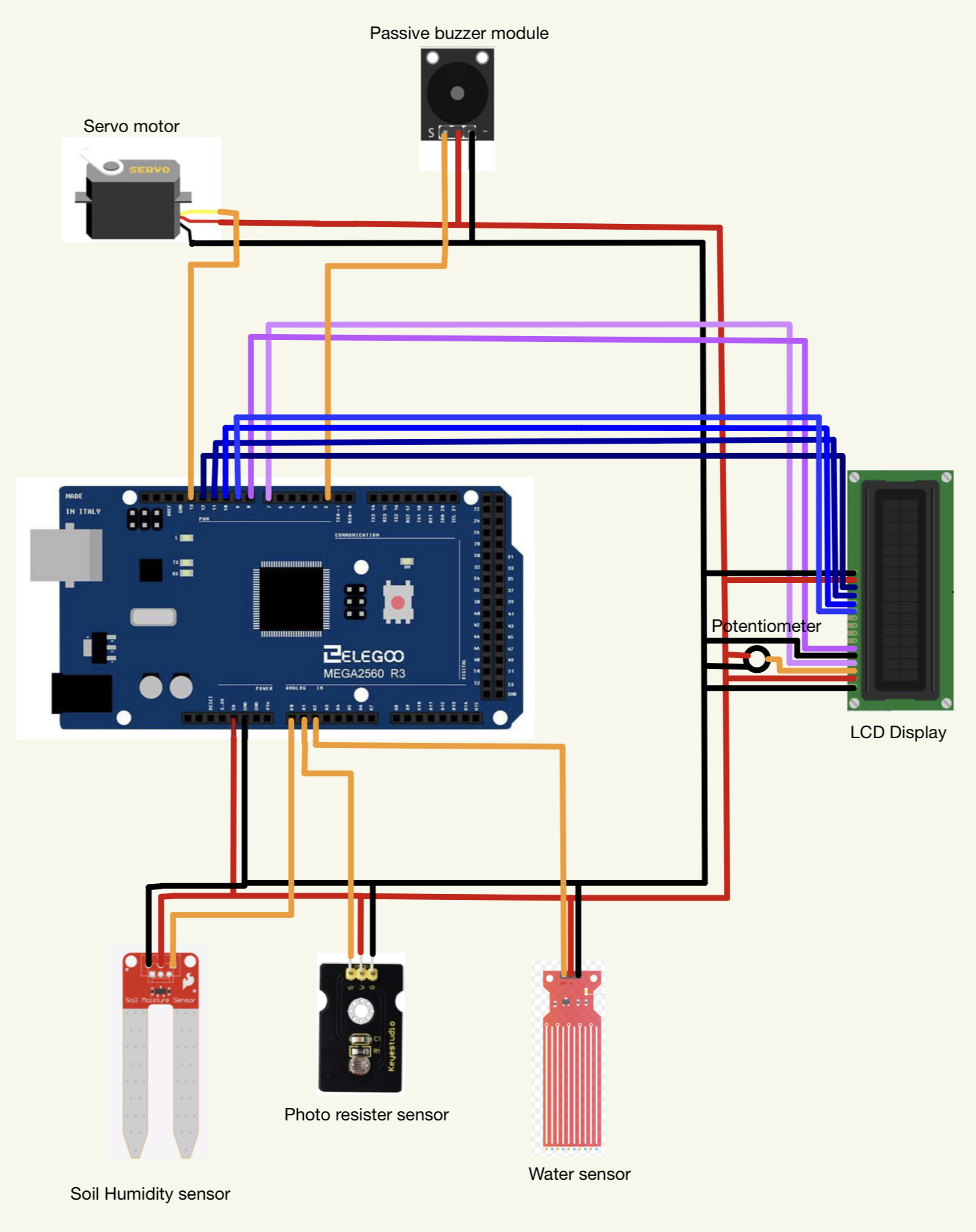 An ELEGOO MEGA2560 R3-based personal plant protection system. The device collects data useful to your plant's health, mainly soil humidity and light intensity. The device uses the collected data to rebalance moisture levels in the soil, by calculating the volume of water needed to bring the soil back to proper humidity levels. The device then takes this calculation and then calculates by using a vertical water tank the amount of time needed to release water to match the volume of the water tank to the volume of water needed. The device does this by reading the current information about the water tank including the height and calculating the volumetric flow rate of the water leaving the tank. If the device senses the water level for automatic hydration is running low it will notify the user via audio signaling to refill the water source.