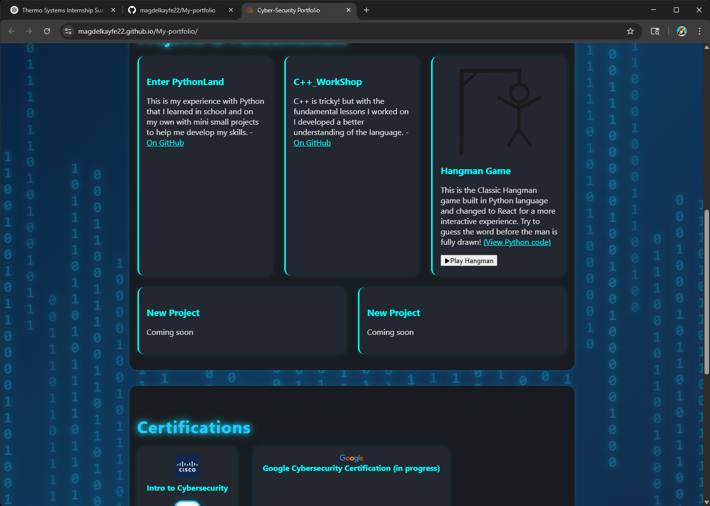 This is a website portfolio that has an about me section, projects section, certifications, and a contact bar to get in touch with me.