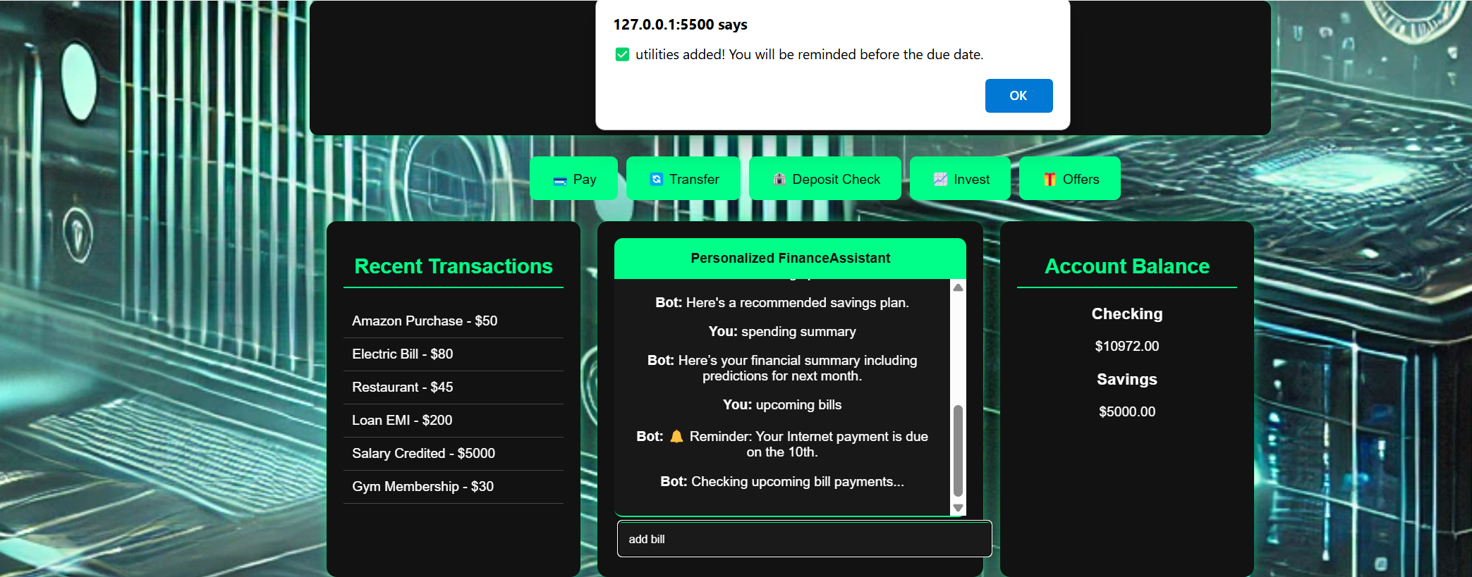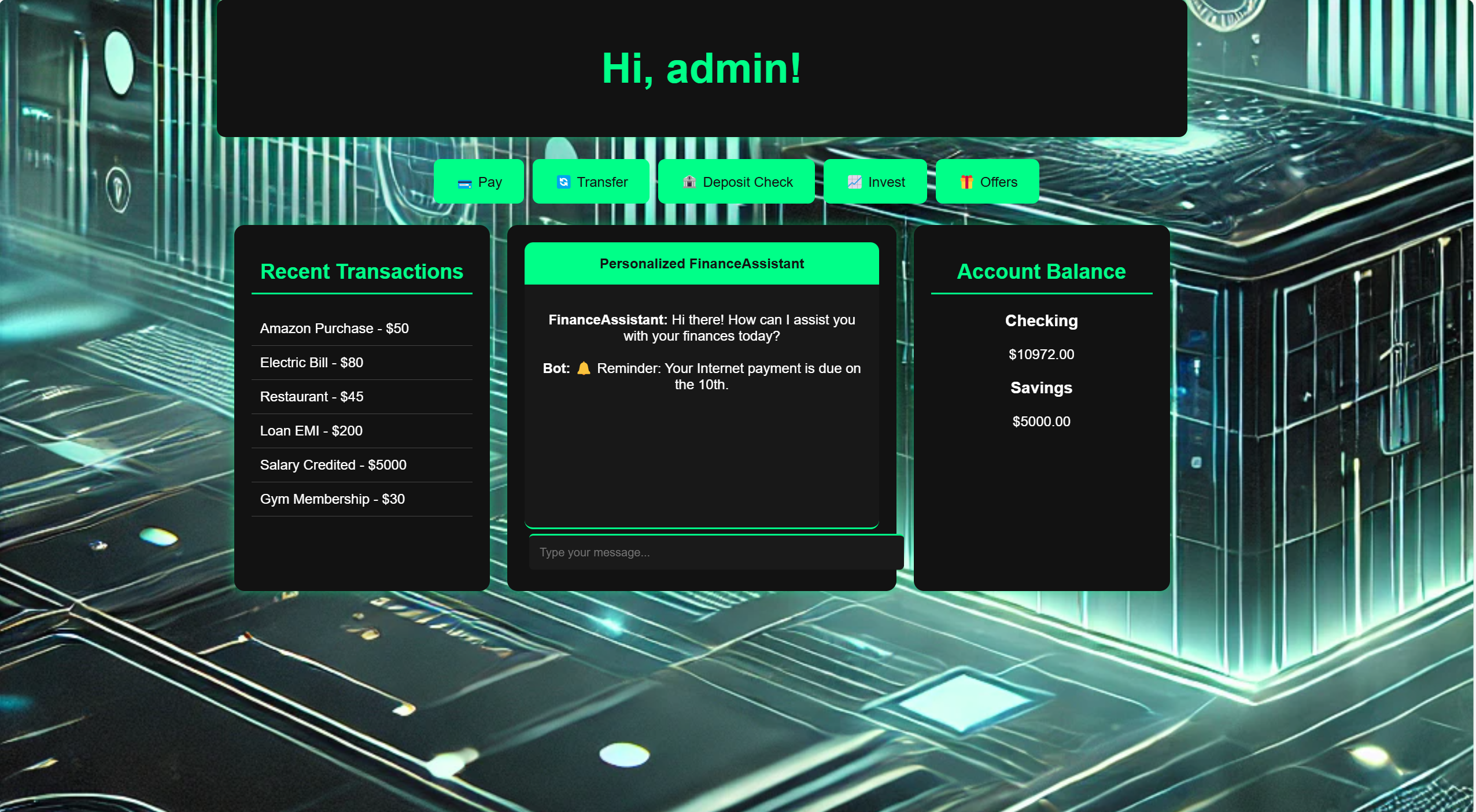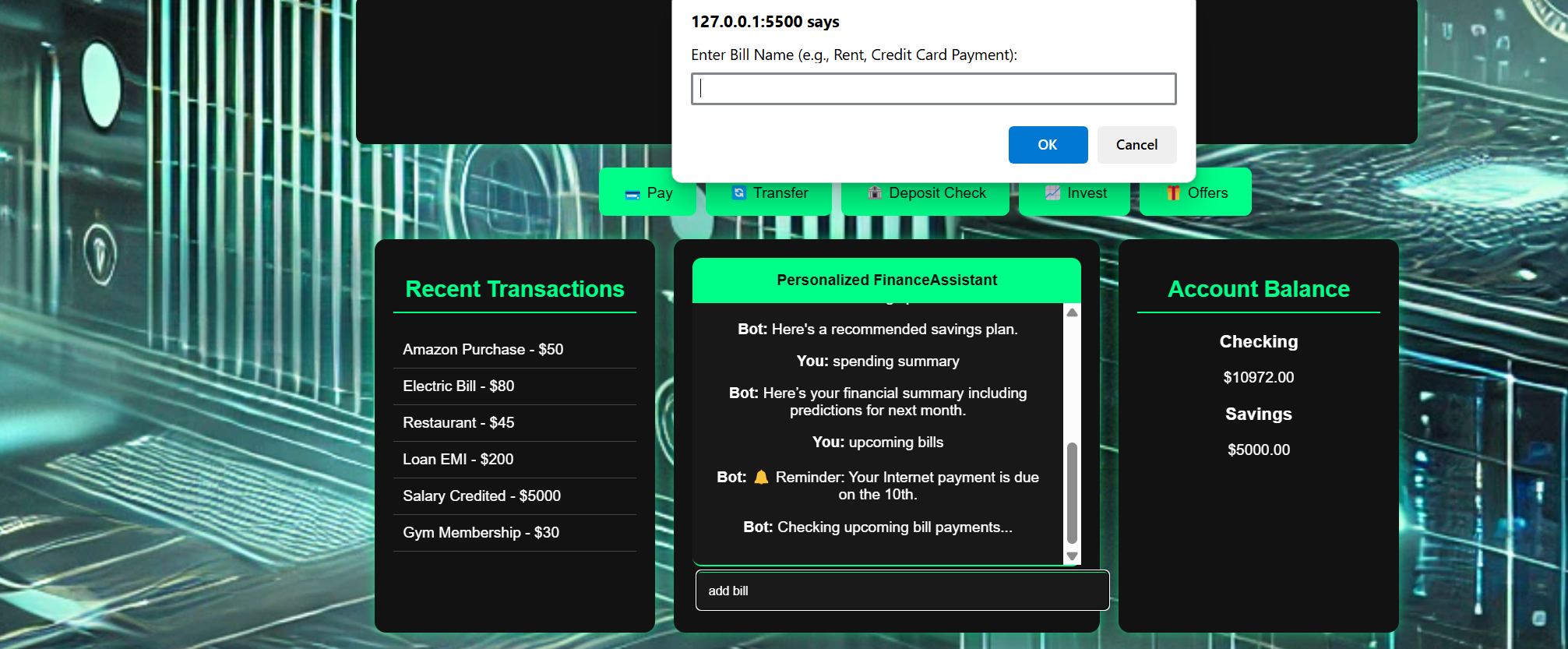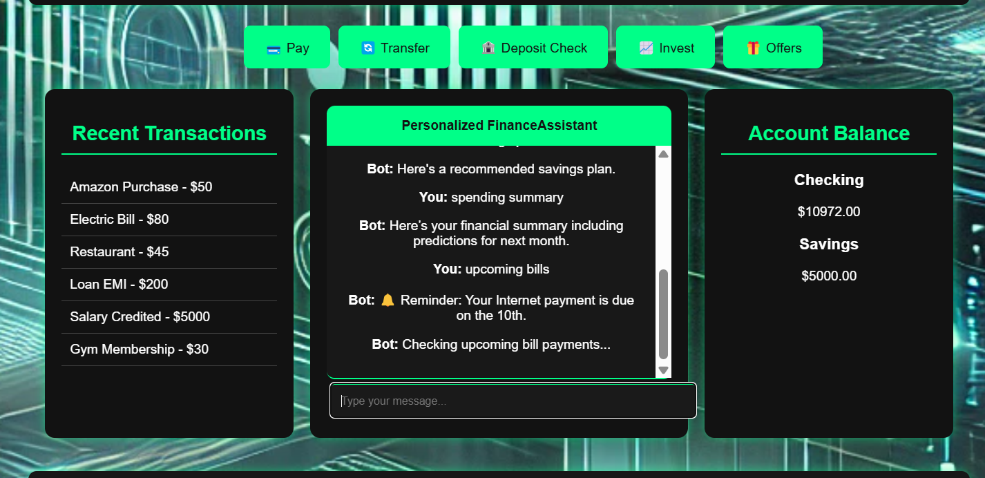 Built with HTML, CSS, and JavaScript, this system incorporates local storage for the tracking of transactions, AI-driven chatbot support, and Chart.js for live financial visualization. The intuitive chatbot allows users to view financial reports, savings plans, eligibility for loans, and AI-powered recommendations in just an instant. These include handling dynamic data of users, implementing accurate predictions, handling financial data securely, and making the chatbot intelligent enough to handle responses pertaining to financial queries. However, we succeeded in building a complete functional financial assistant comprising an interactive AI-powered chatbot, real-time stock market tracking, and predictive analytics on loans and savings.
