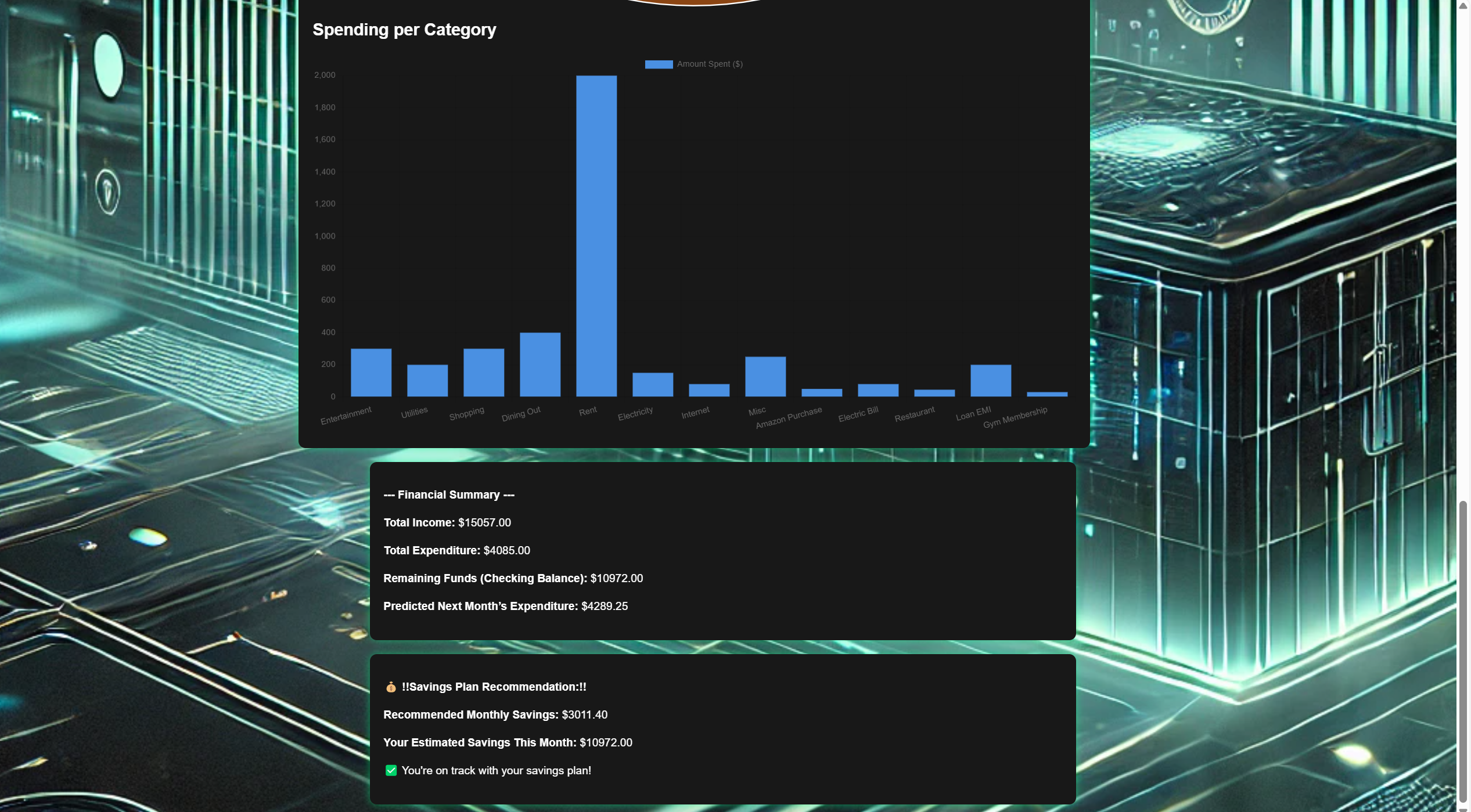 In this project, we learned valuable lessons on AI in financial decision-making, the power of a clean user-friendly interface, and how to represent financial insights through data visualization. Our system will also be improved in the near future to include credit card and auto loan eligibility prediction, AI investment recommendations, expense forecasting, integration with multi-bank accounts, and even voice-activated finance assistants. As digitization in banking keeps advancing, so does our Personal Finance Assistant: a bridge between artificial intelligence and personal finance that makes financial decision-making smart, intuitive, and highly personalized.