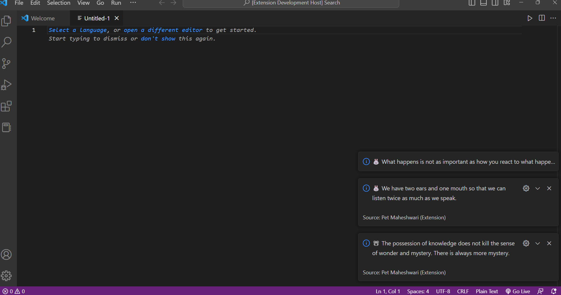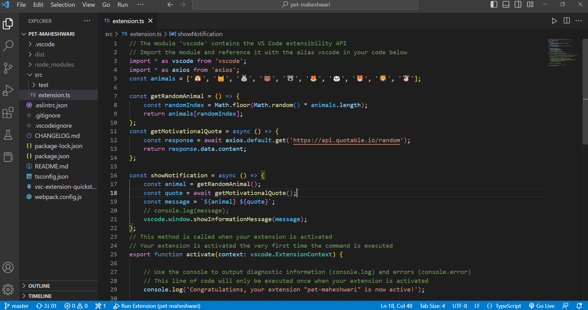 Recently noticed that my productivity tended to wane after extended periods of time spent coding. To address this issue, I came up with this idea to keep myself inspired and focused while working. Then decided to create a Visual Studio Code extension that would send a notification every 5 minutes with a random animal emoji and a motivational quote.