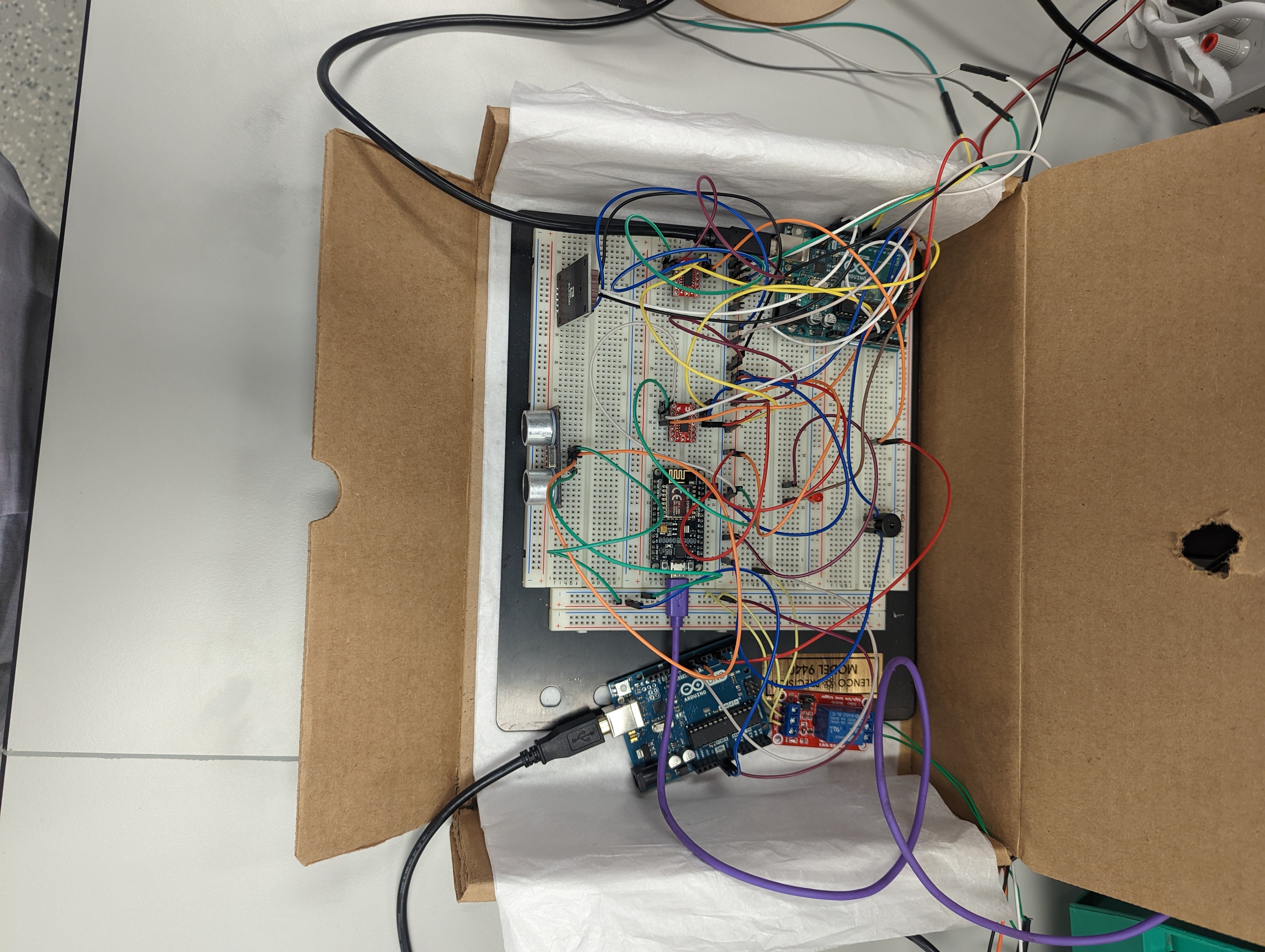 Power Management was a challenge given the number of components we used. Both the ultrasonic sensor (used for water dispensing mode 2) and the servo motor used the Timer 1 of the Arduino and this prevented us from using them simultaneously. This prompted us to use a secondary Arduino for the ultrasonic sensor with all the other setup controlled by the primary Arduino.