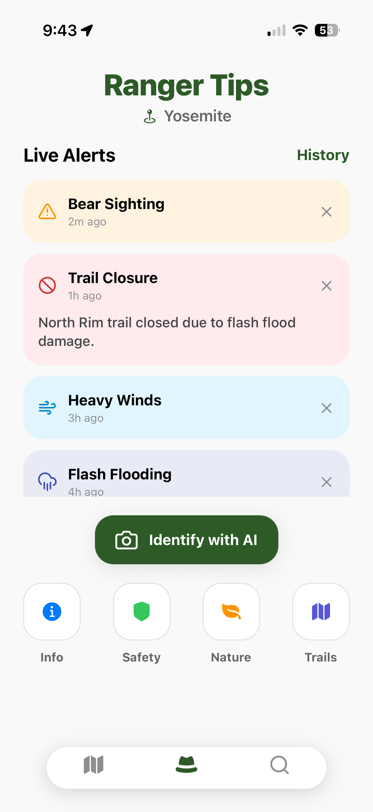 AR Trail Marking: Using Augmented Reality to overlay trail paths and "cool sights" directly onto the camera view. Display more precise warnings as users travel throughout the park.