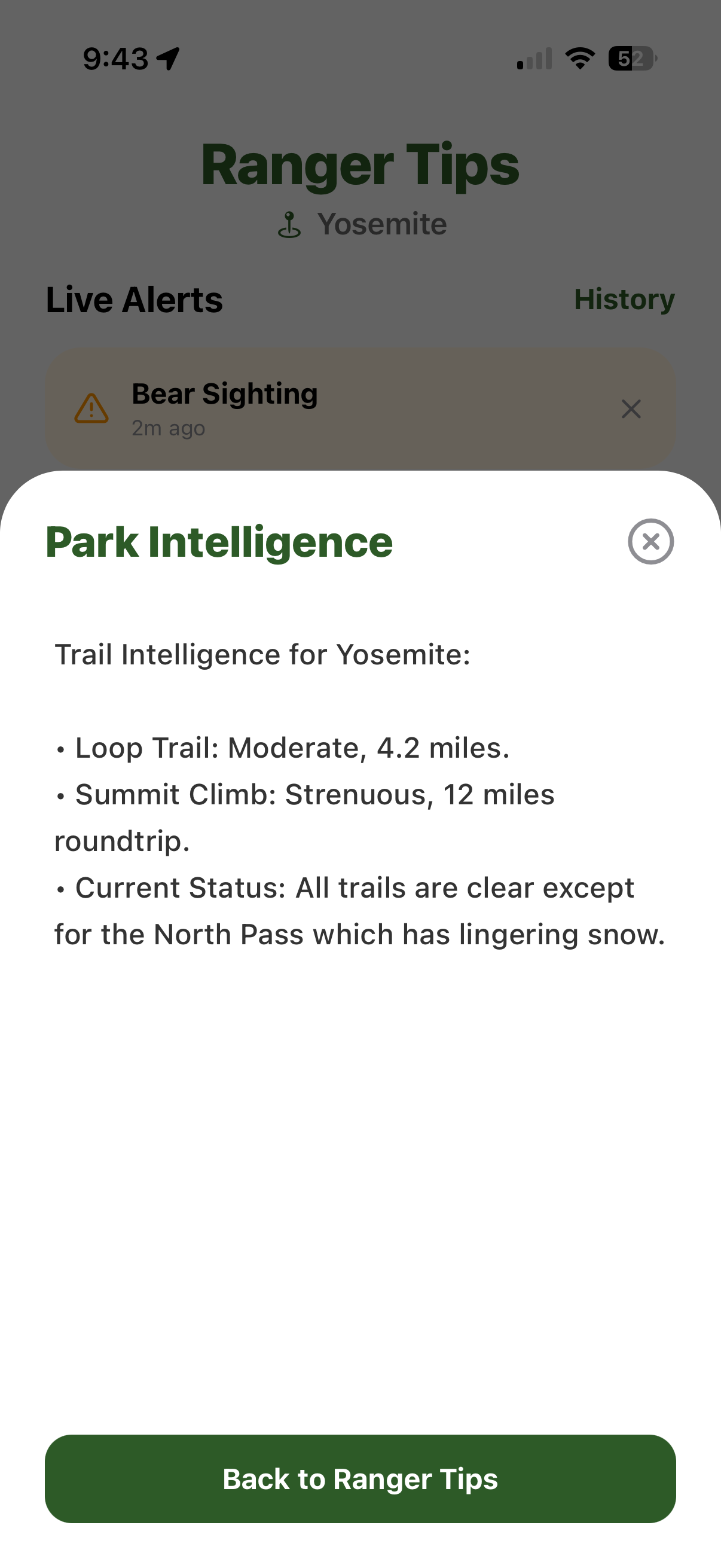 Recently, I went on a camping trip to Silverwood Lake SRA and was instantly struck by two things: the breathtaking beauty and the lack of cell service. I realized that while the parks provide maps and safety warnings like toxic algae warnings, rattlesnake sightings, or "leave no trace" reminders they are often locked behind a QR code or a physical board at the trailhead that you can't access once you're miles into the backcountry. I wanted to build a "Park Ranger in your pocket" that stays with you at all times.