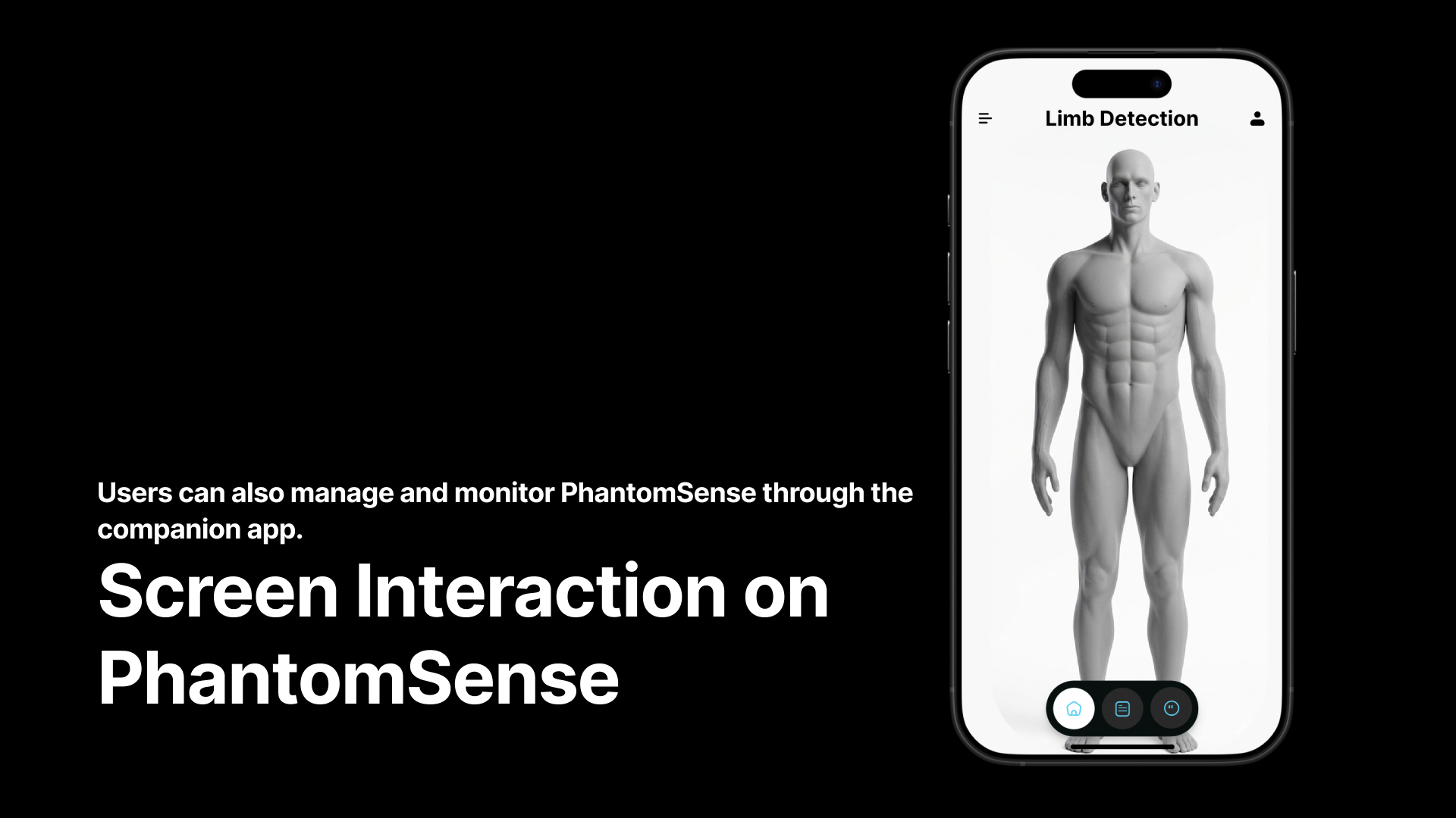 PhantomSense is a wearable rehabilitation system designed to support people experiencing phantom limb pain. The device detects muscle signals near the amputated limb using a sensing patch. When users attempt to move their phantom limb, the system captures these signals and translates them into visual and haptic feedback. A transparent display worn on the residual limb provides visual responses that react to the user’s muscle signals. At the same time, the wearable patch can generate vibration to create tactile feedback. Through repeated interaction between movement intention, visual feedback, and tactile feedback, PhantomSense helps train the brain to rebuild its internal body map, potentially reducing phantom limb pain over time. Users can also connect to a companion mobile app to monitor training activity, muscle signal patterns, recovery progress, and pain trends.