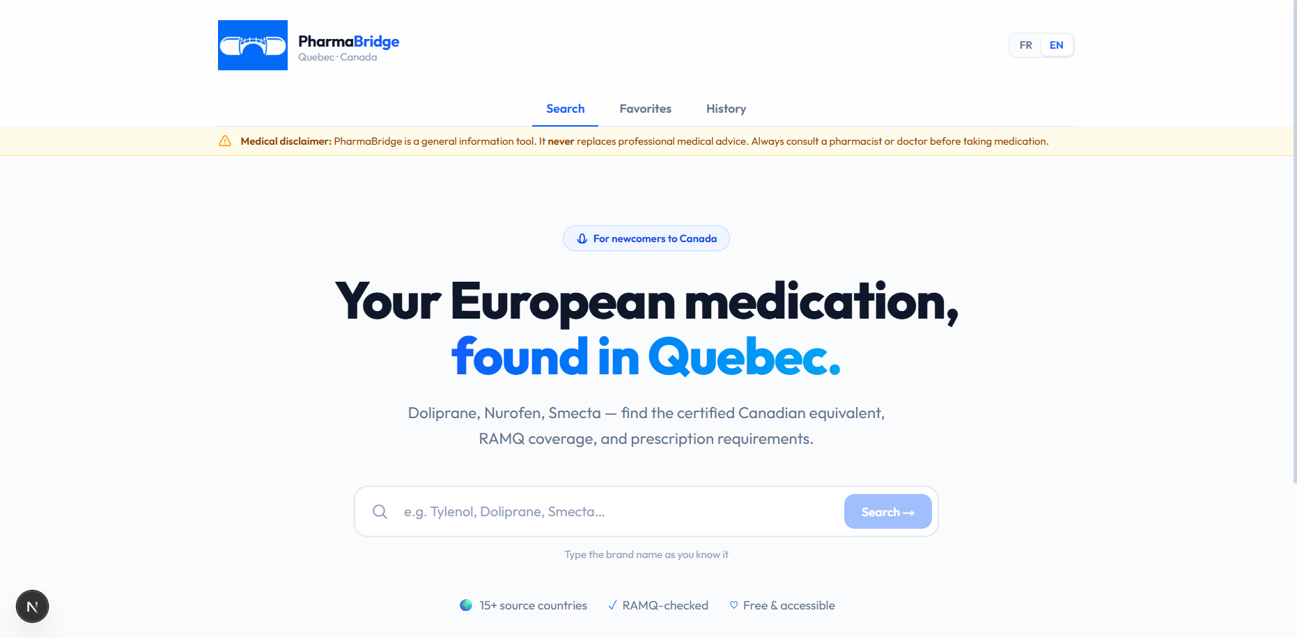 PharmaBridge lets you search for any medication by its European brand name and instantly find: