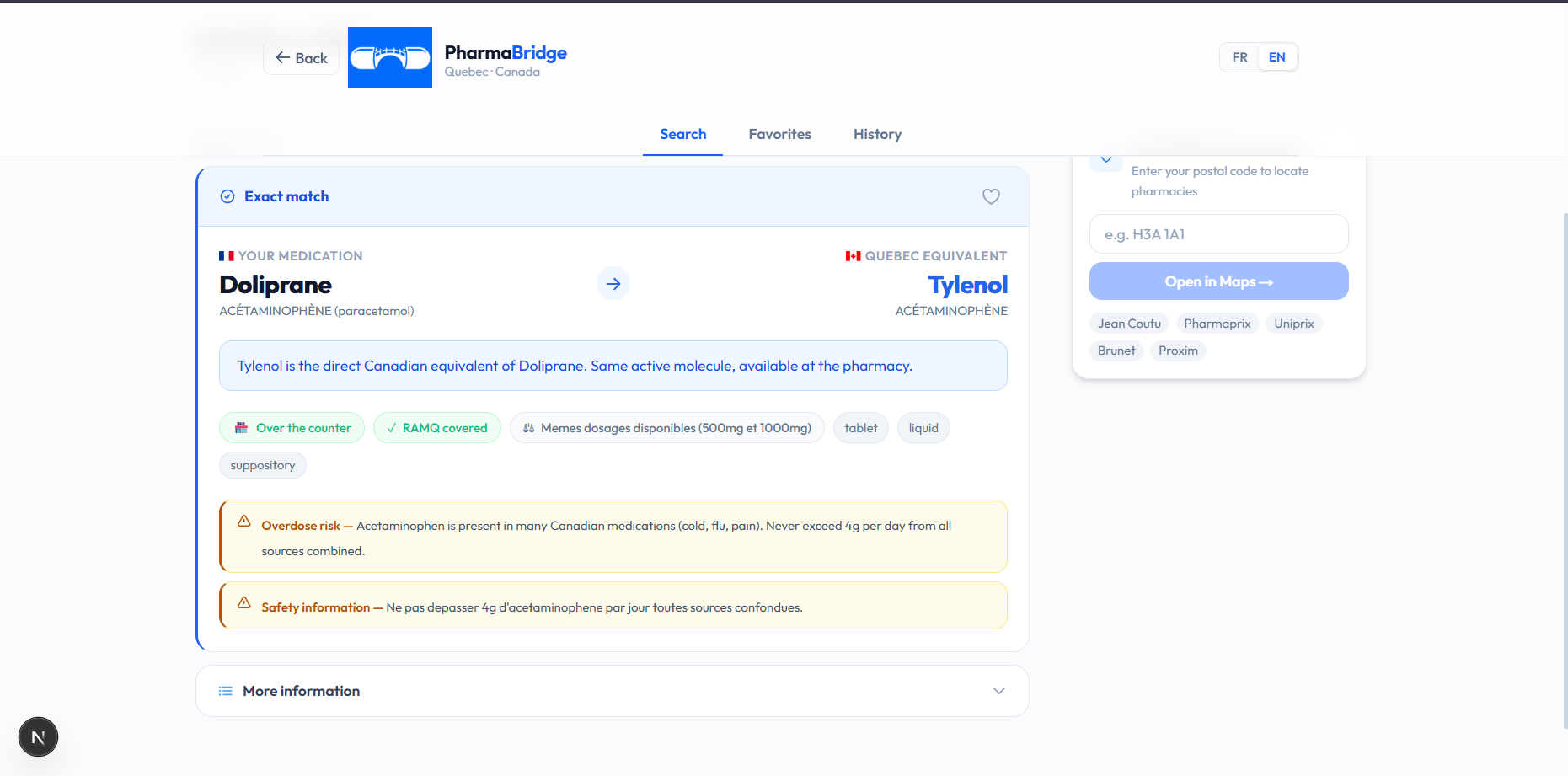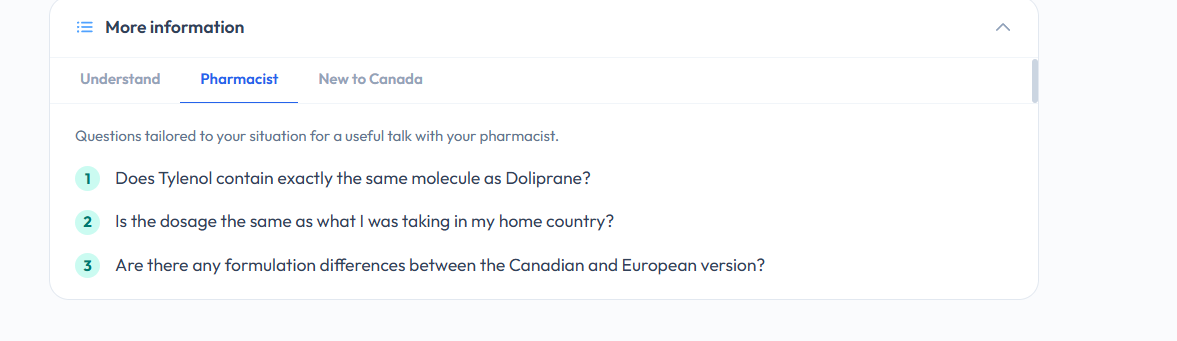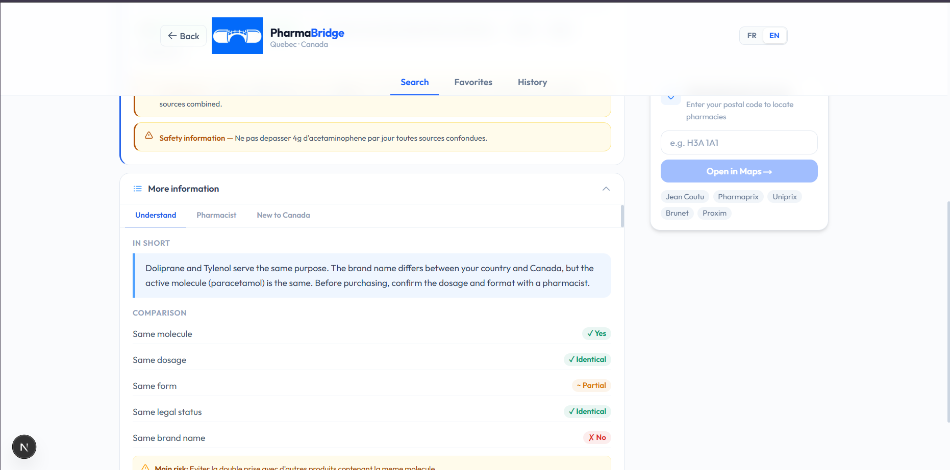 Its Canadian equivalent (brand name + generic) The match type: exact same molecule, same molecule with dosage differences Safety alerts: prescription status changes, overdose risks, controlled substances Confidence level with reasoning