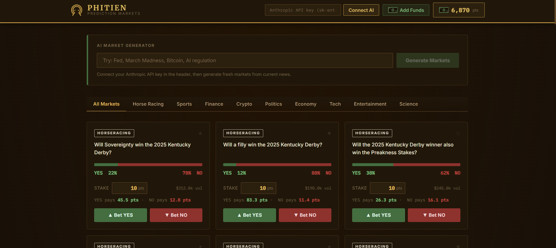 Phitien is a prediction market web app where users can browse markets, buy YES or NO positions, track their balance, and view their open bets. It also includes an AI-powered market generator that creates new prediction markets from current topics, making the platform feel dynamic instead of relying only on hardcoded data.