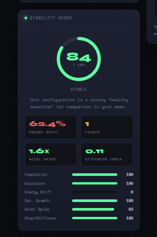 Track stability indicators including energy drift, oscillation growth, and acceleration spikes