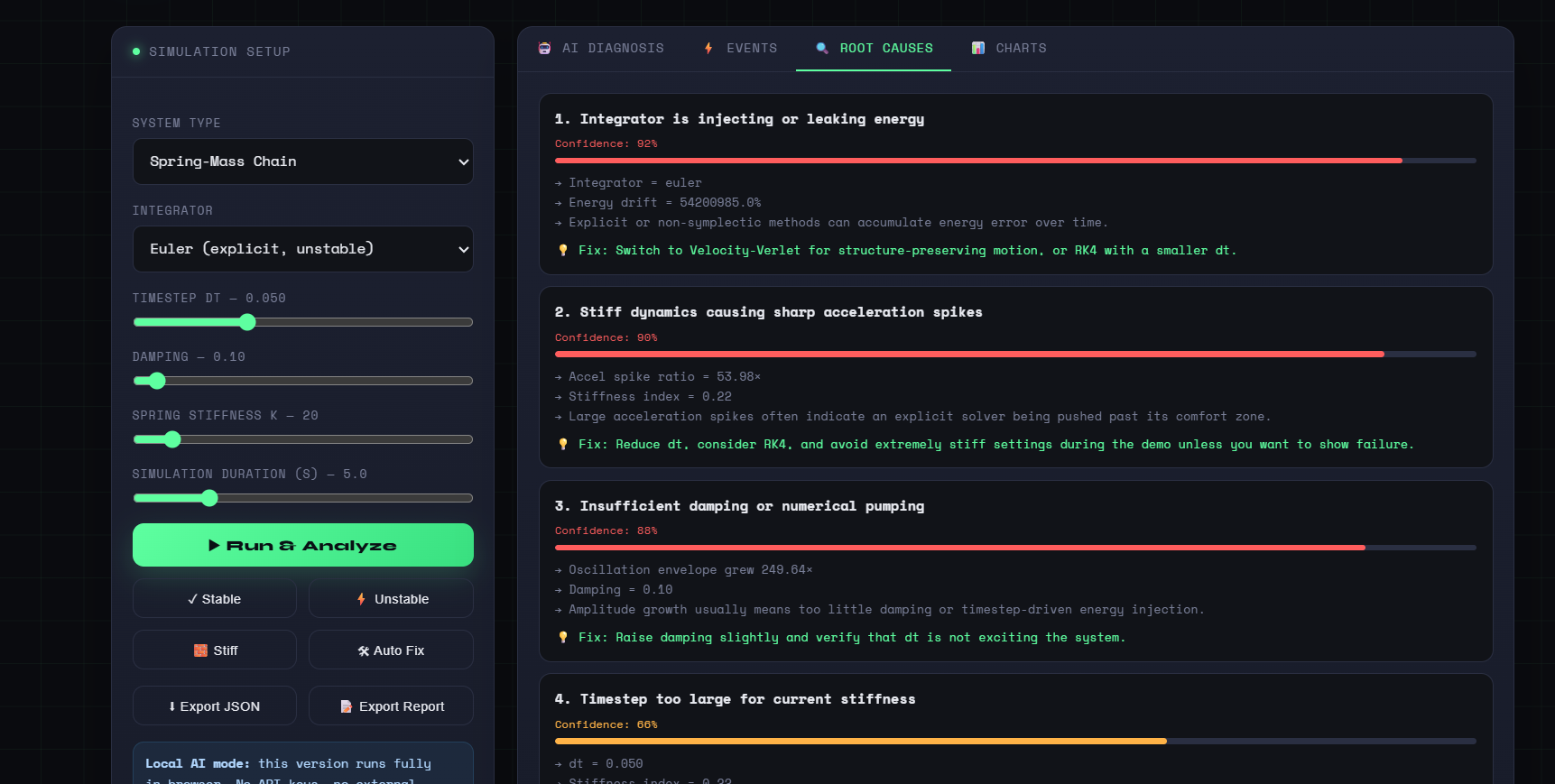 The system runs physics simulations, measures stability indicators such as energy drift, oscillation growth, and acceleration spikes, and converts these signals into an interpretable diagnosis.