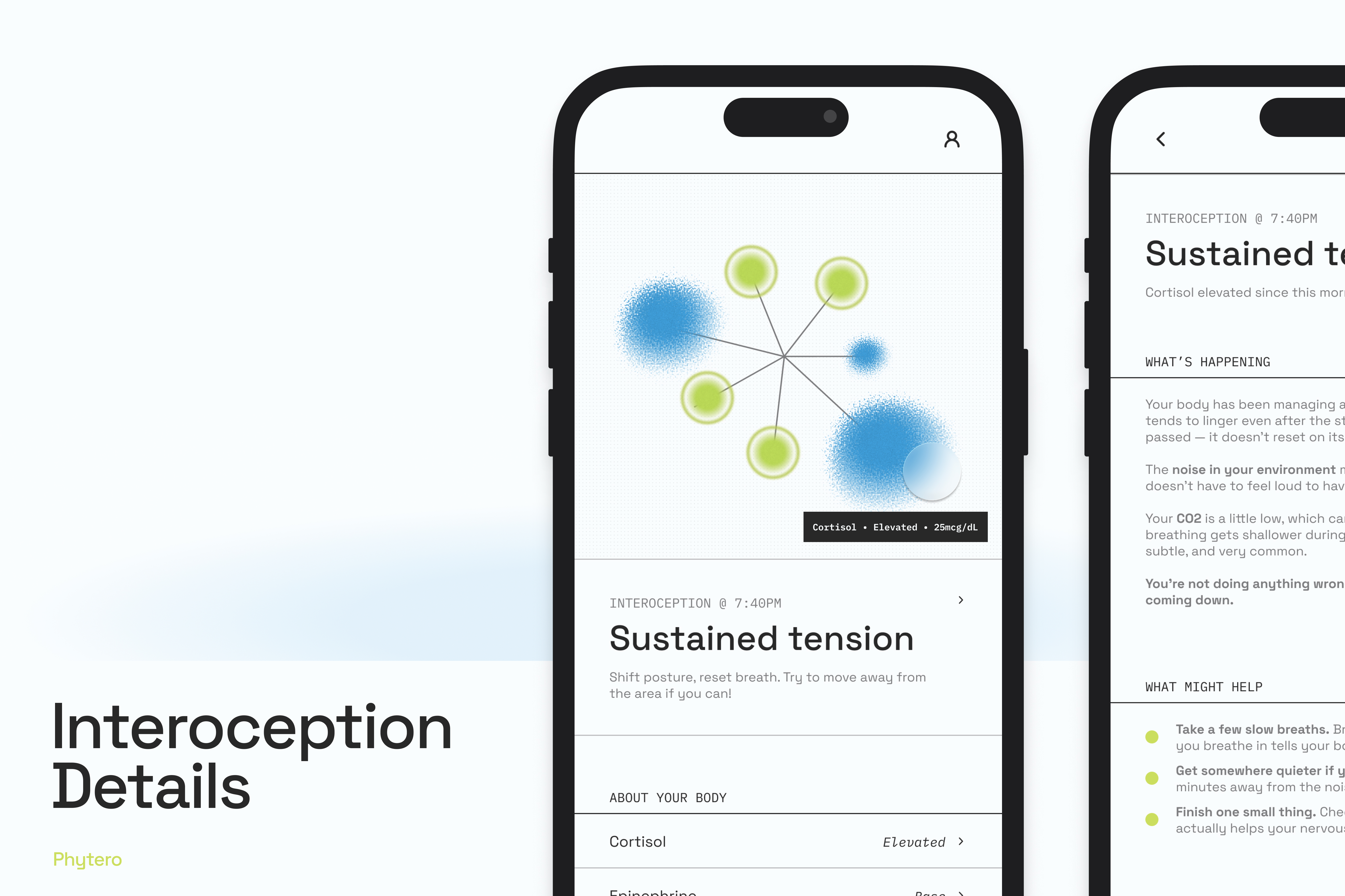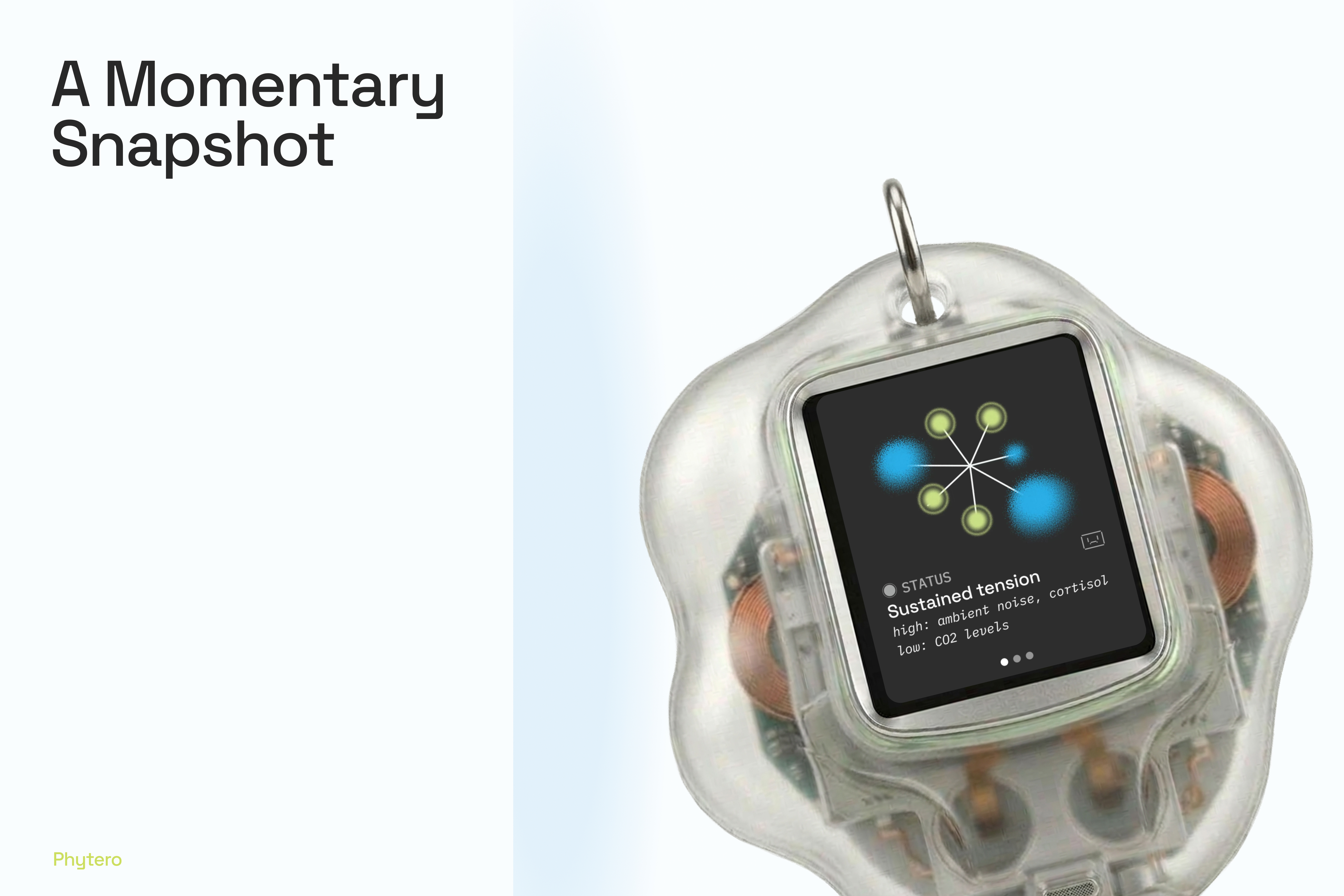 Phytero turns your body's stress signals into something you can actually see. It's an abstract, living visualization that shifts with your internal state: green and calm when your environment is working for you, blue and restless when stress hormones are climbing.