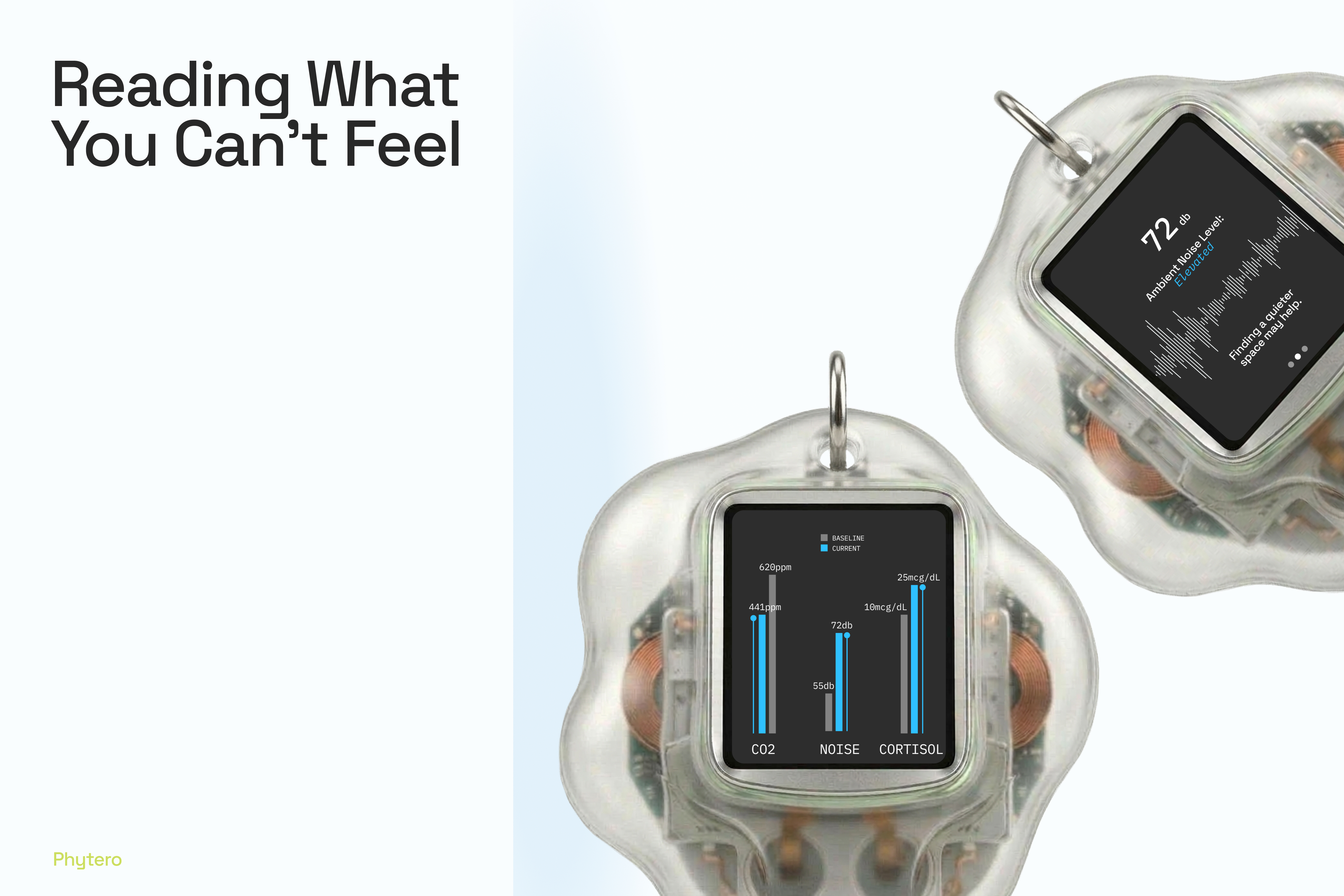 Under the hood, Phytero reads three stress hormones in sweat: cortisol, epinephrine, and norepinephrine, alongside environmental data like CO₂, noise, and temperature. It's grounded in real published science (Stressomic, Science Advances, 2025). It never reads a single value in isolation. Combination, duration, and context are all cross-referenced against your personal baseline. Patterns surface automatically over time, no manual logging required. And if you don't want continuous input, check-in mode lets you control when you engage.
