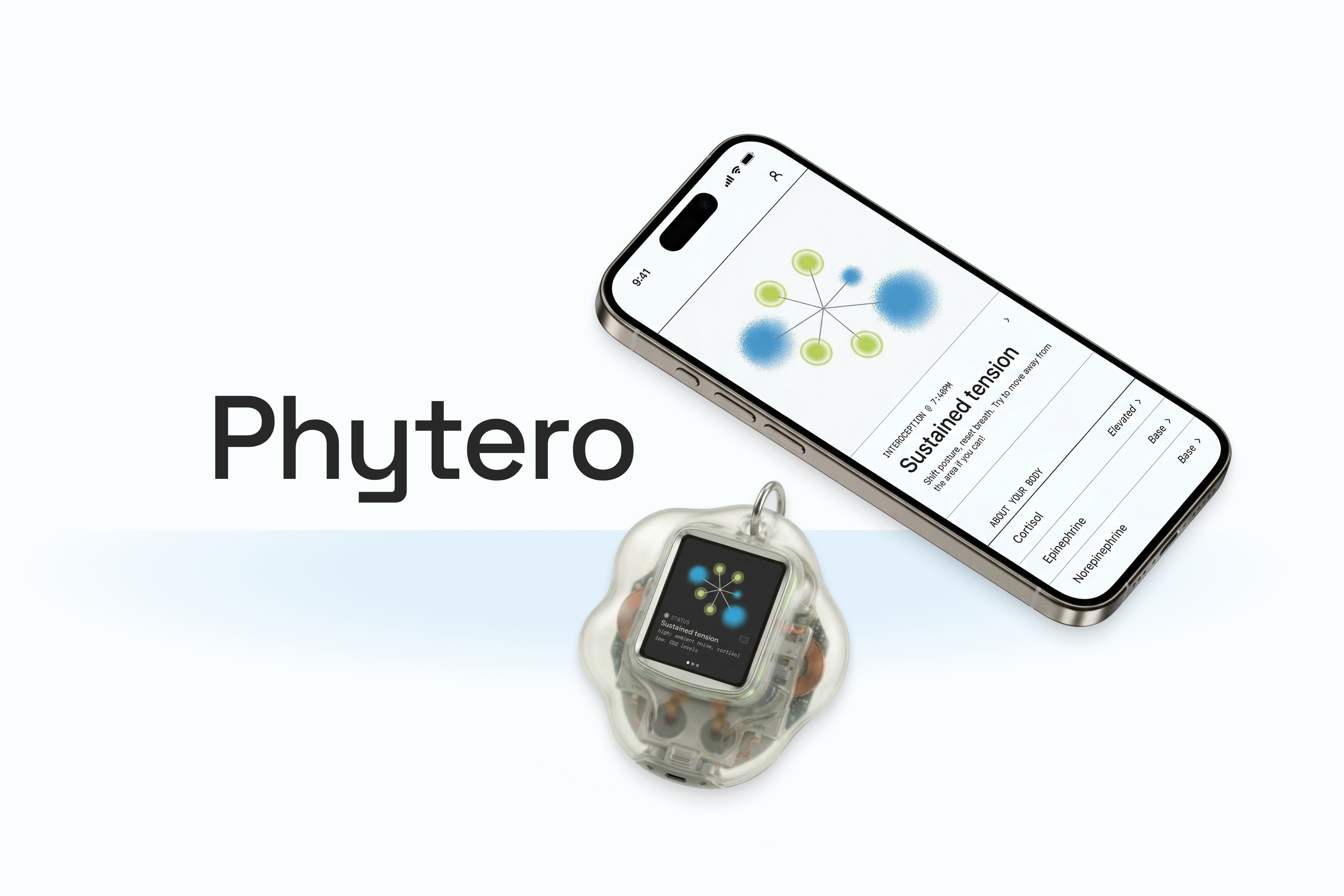 There are two surfaces. The main device is a standalone wearable, a translucent keychain pendant with a small screen that works without your phone. The companion app is for when you want to go deeper: interoception history over time, hormone breakdowns, pattern observations, and settings. Core functionality lives on the device; the app is supplemental.