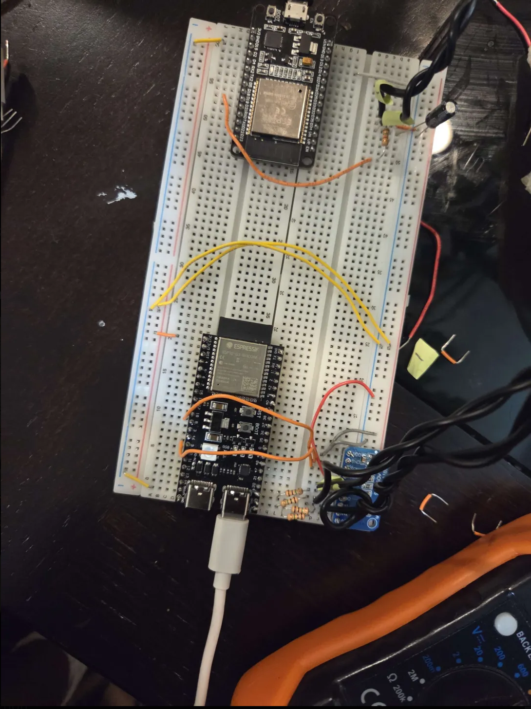 PhytoClone started as a challenge where we asked how we could capture a very small electrical signal from a plant, send it wirelessly, and recreate it in another plant using simple parts and open source code. To do this, we placed two small needle electrodes into the stem of a tomato plant. One electrode picked up the signal, and the other acted as a reference point. When the plant was stressed, it produced tiny electrical signals that traveled through its stem. Because these signals are extremely weak, we had to amplify them right away using a simple transistor circuit. We also added a filter to remove noise and keep only the slow biological signal we were interested in. After cleaning the signal, we sent it into a high-precision converter that turned it into digital data. A microcontroller then read this data, tracked the normal signal level, and detected when a stress event happened. When it noticed a change, it sent the signal wirelessly to another microcontroller connected to a second plant. This allowed us to transfer the signal from one plant to another in real time. On the receiving side, the second microcontroller recreated the signal and adjusted it to match the natural strength of a plant’s electrical signal. It then sent this signal into the second plant using another set of electrodes. We also added a second set of sensors to monitor how the second plant responded. This helped us see if the plant reacted to a signal that did not originally come from itself. In the end, we built the entire system on a breadboard using basic electronic parts and simple code, creating a working connection between two living plants. ## Challenges we ran into We were planning to use more ESP-32s but we found out that 2 of our ESP were destroyed due to static discharge from mishandling the controller. Because of our limited amount of ESPs that we had it almost made it impossible to complete our project, however we had found one more ESP deep inside of our storage box. Another challenge that we had was measuring the output from the plants because the voltage was so low that outside signals were interfering with it.