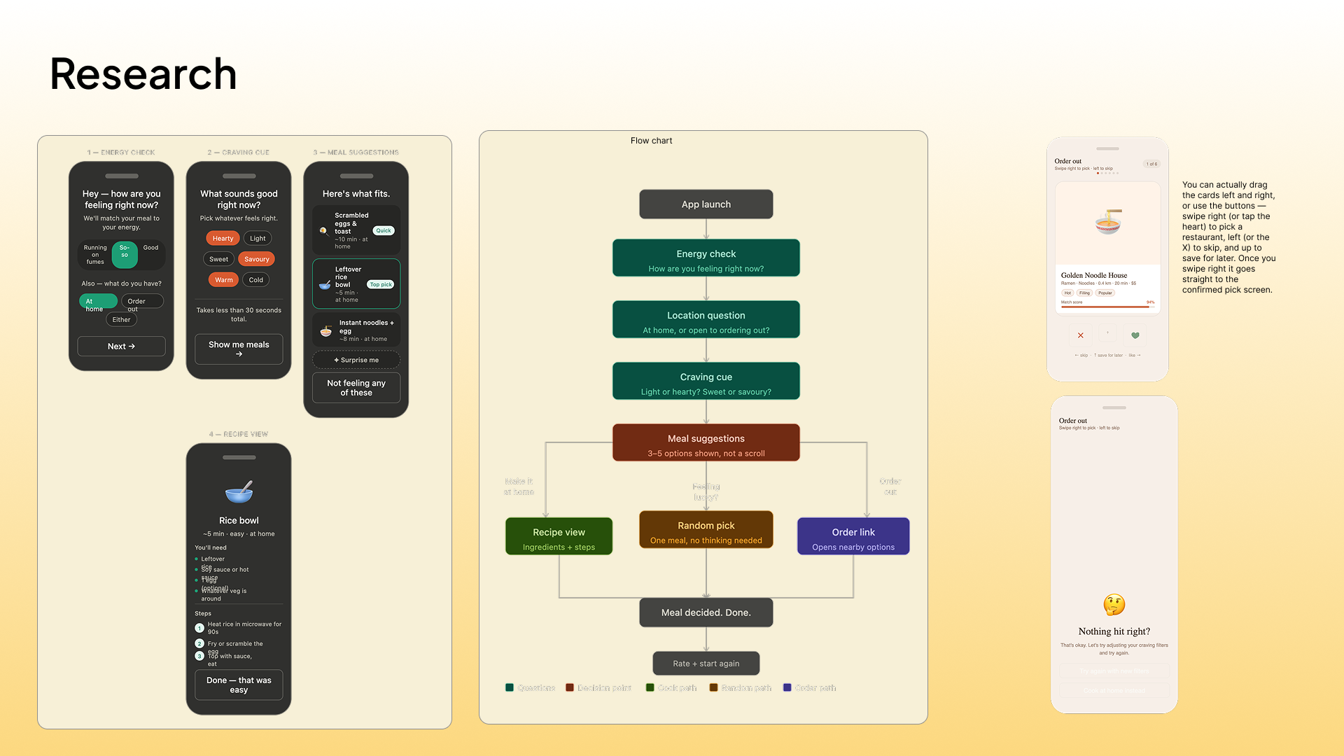 The biggest challenge we ran into was designing the swipe feature for ordering out. The concept sounds simple: swipe right to pick a food, left to skip, but making it feel intuitive and frictionless in practice took far more iteration than we expected. We had to rethink what information actually needed to be on each card; too much, and it became another overwhelming menu, too little, and it didn't give people enough to make a confident yes or no call. We landed on showing just the cuisine, distance, and estimated time, based on their earlier answers. We also had to think carefully about what happens when a user swipes left on everything, making sure the fallback felt supportive rather than like a dead end. Getting the swipe feature to feel calm, fast, and genuinely useful rather than just novel was the hardest problem we solved.