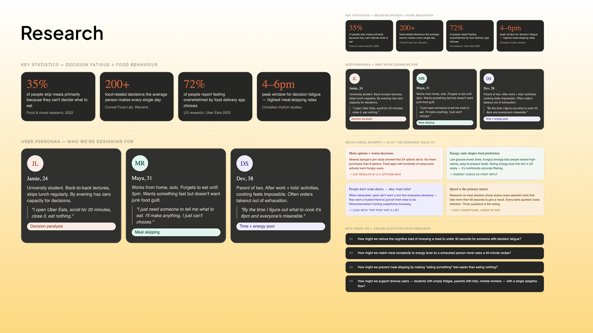 The next step for Picksy is real-world user testing, putting the prototype in front of people at the exact moment they're trying to decide what to eat, and measuring whether it actually reduces the time and stress of that decision. Longer term, Picksy could expand beyond meals to other daily micro-decisions that cause disproportionate stress, such as what to wear, what to watch, and what to do this evening. The problem Picksy solves isn't really about food. It's about what happens to decision-making when people are tired, and how design can quietly carry some of that weight.