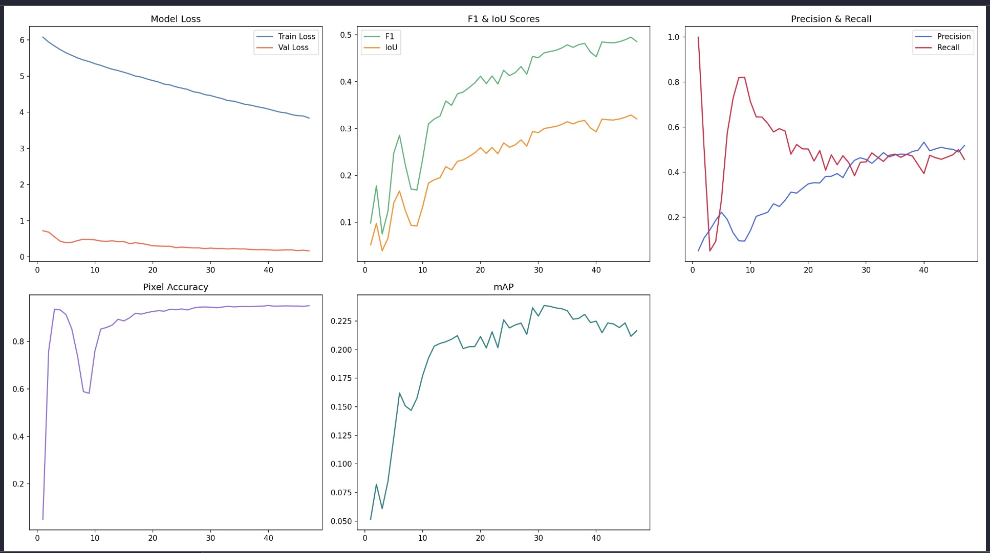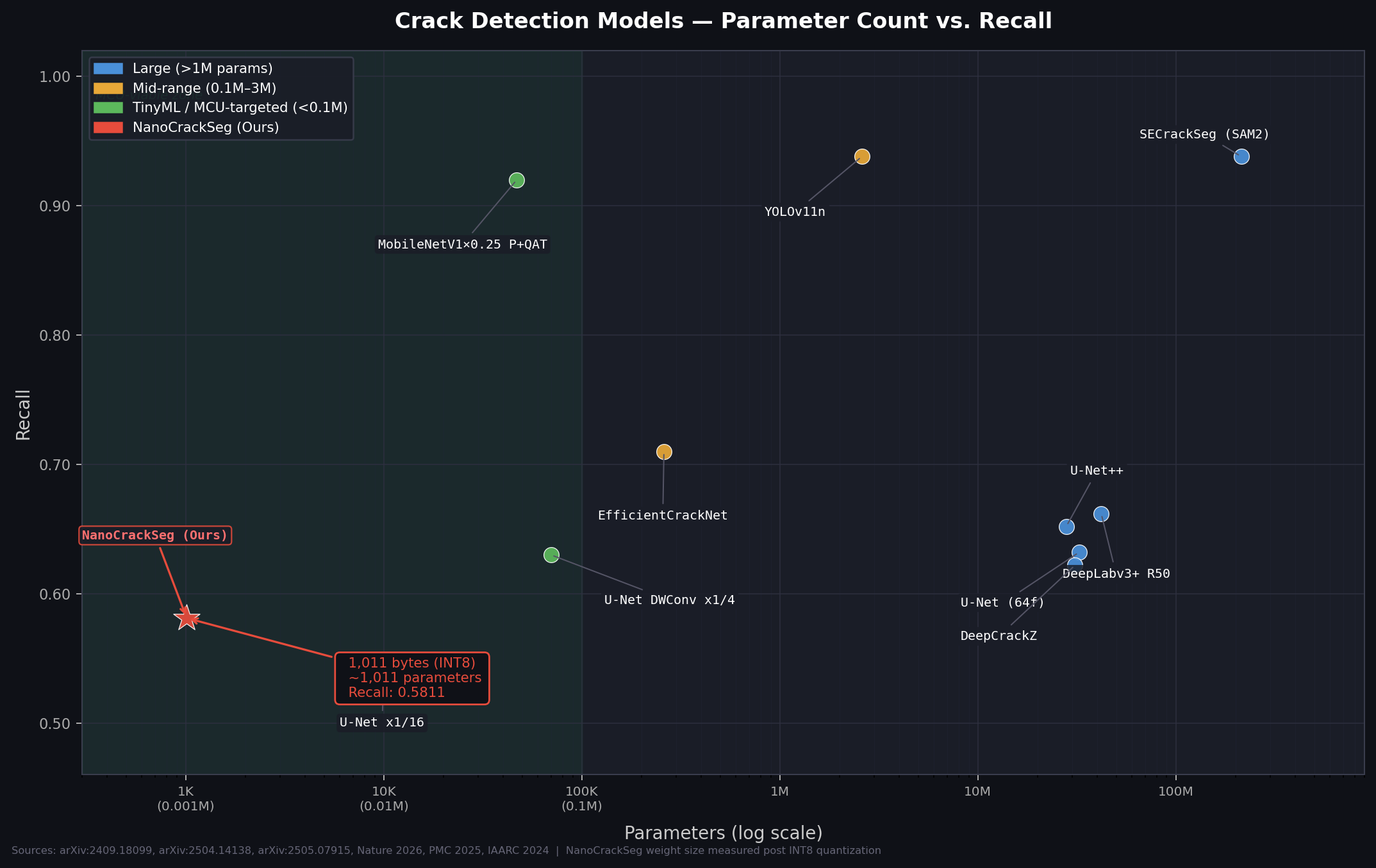 We managed to make the world's smallest crack segregation model while still boasting similar scores in Recall, a key metric for analyzing the performance of segregation models, with models with hundreds to thousands of times more parameters than us. This also makes our model the most efficient crack segregation model that is publicly known.