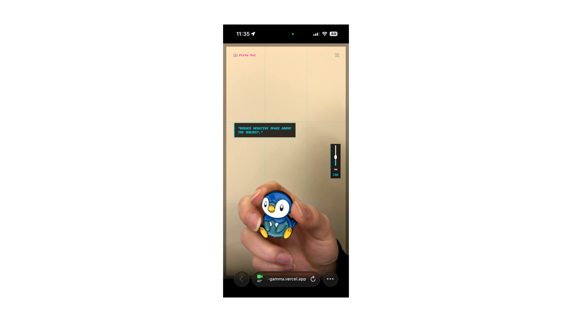 Picto Pal is an AI-driven photography coach designed to help you elevate your personal photography using devices we carry around everyday in our pockets. Using a live camera interface, the app analyzes your shot and gives you advice on one thing you can improve. When you capture a photo, the MediaDevices API sends the browser's current video feed to Gemini 2.5 and Gemini evaluates the composition, lighting, depth, layering, etc., and provides instant, actionable advice such as "center subject in the frame" or "too much light coming from the window, try moving away from it" to help you bridge the gap between a simple and professional-looking photograph.