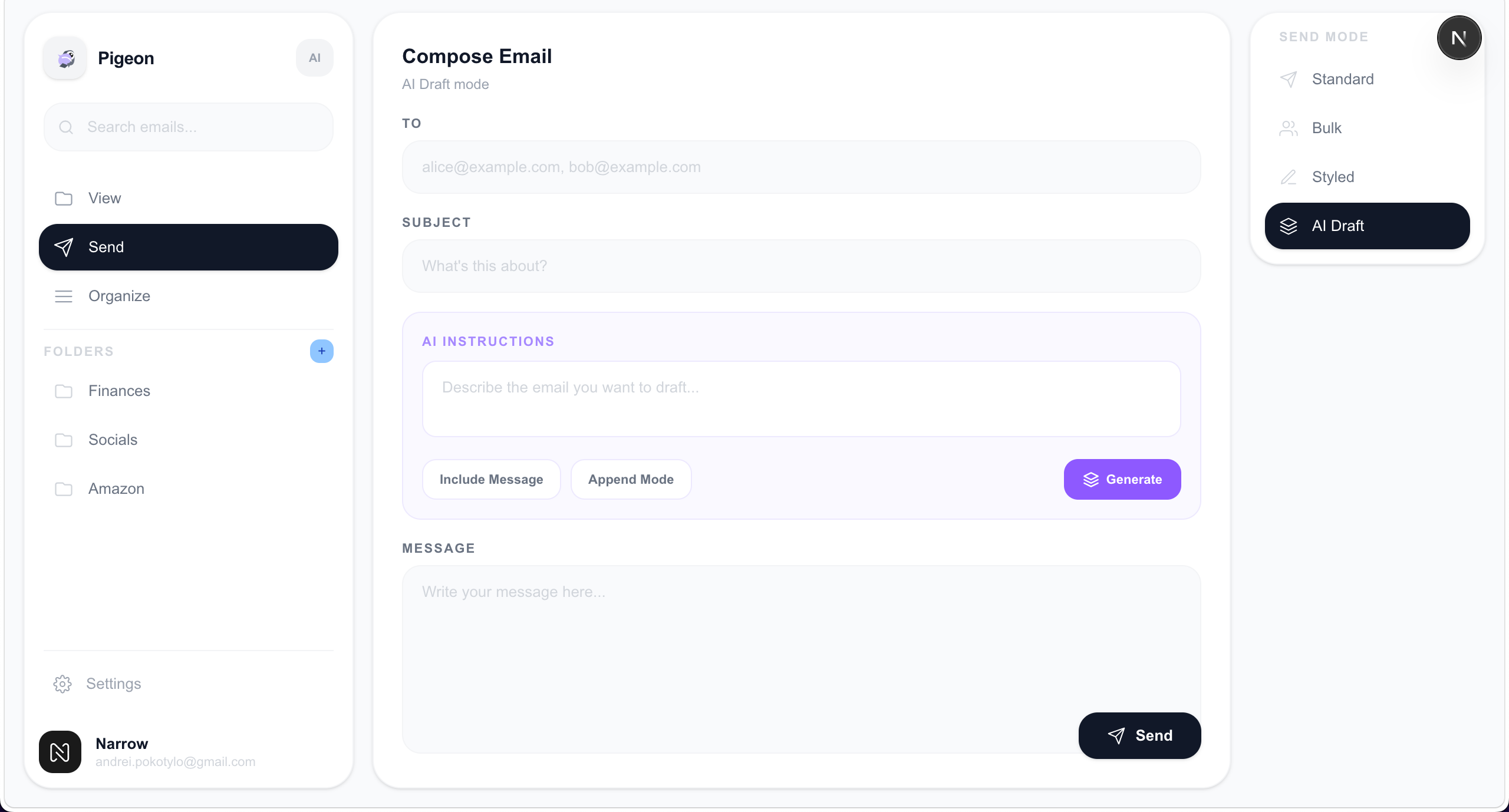 We built Pigeon using Next.js and React JS along with Tailwind CSS. We used the Gmail API to get, send, delete, and help with the categorization of emails. Our authentications are done with Google's OAuth, and database needs are fulfilled with MongoDB. To ensure full security, we use only email reference ids and never directly save user data on our platform, aside from preferences and categories. Additionally, many of our AI features go through Palantir's AIP platform by utilizing an AI Logic application function connected to Claude Opus 4.6 that we have implemented into our project by turning it into a downloadable SDK package. This implementation guarantees that the LLMs only get necessary information and cannot train off of it, ensuring that user data is fully protected.
