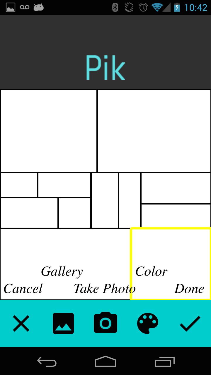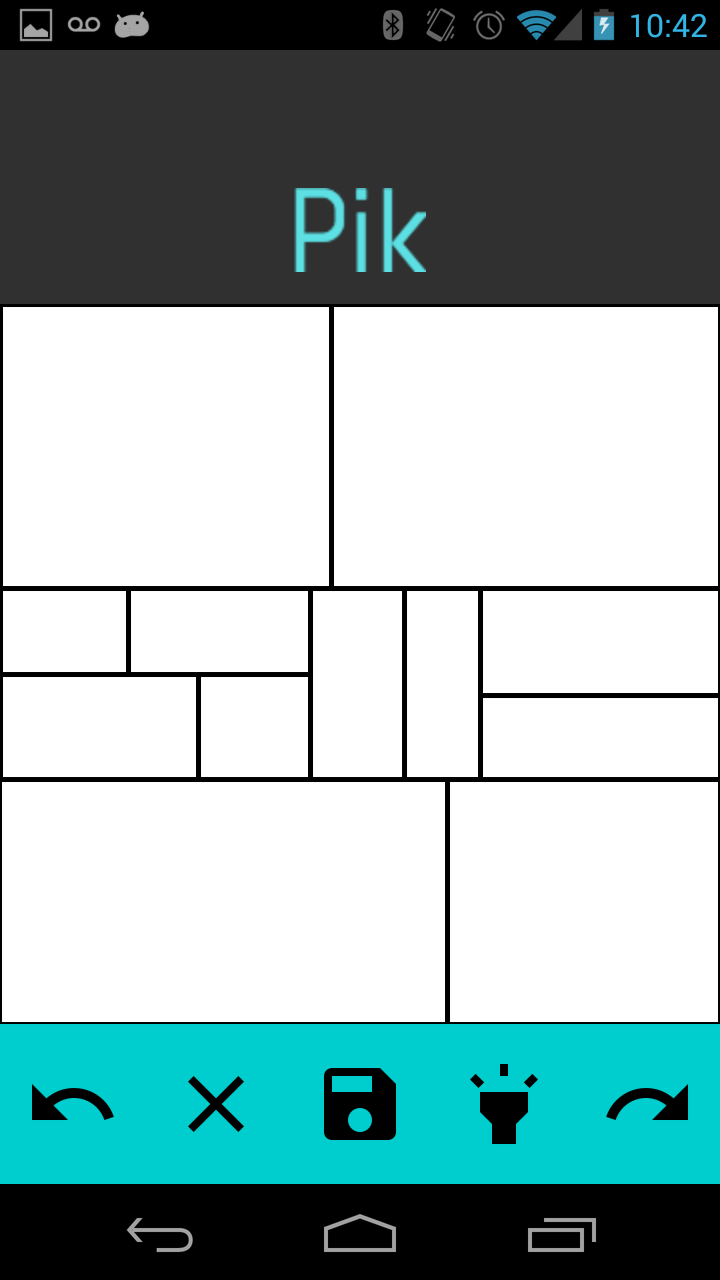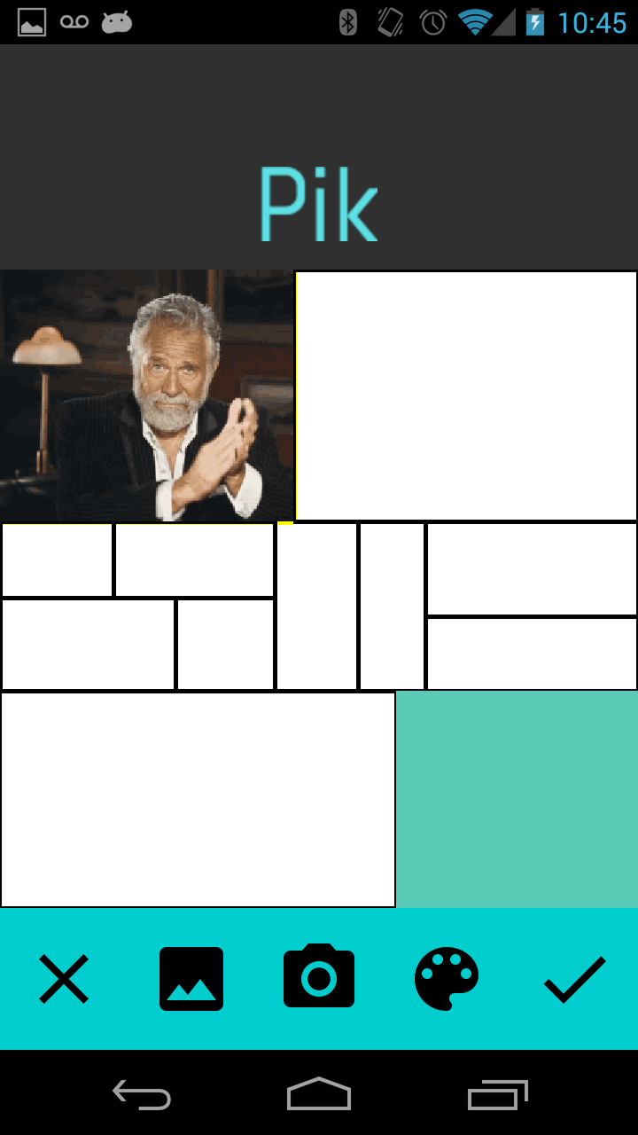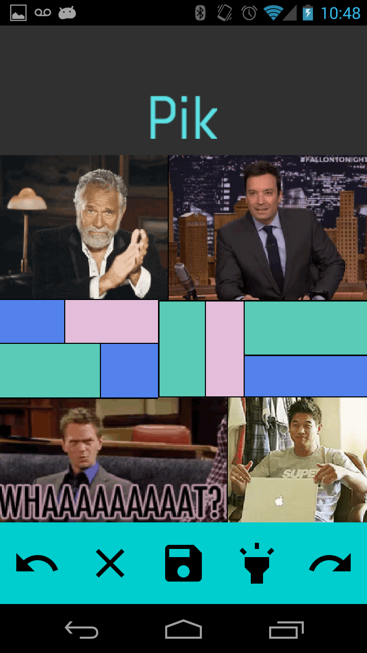 Pik gives you a blank canvas, which you can slice with your finger to form any arrangement of picture windows. Then, you can fill these picture windows with pictures saved in the phone's gallery, taking pictures from the camera, or with solid colors chosen with a color selector. You can undo and redo changes, make more splits as you go along, and save the final image to the phone's gallery.