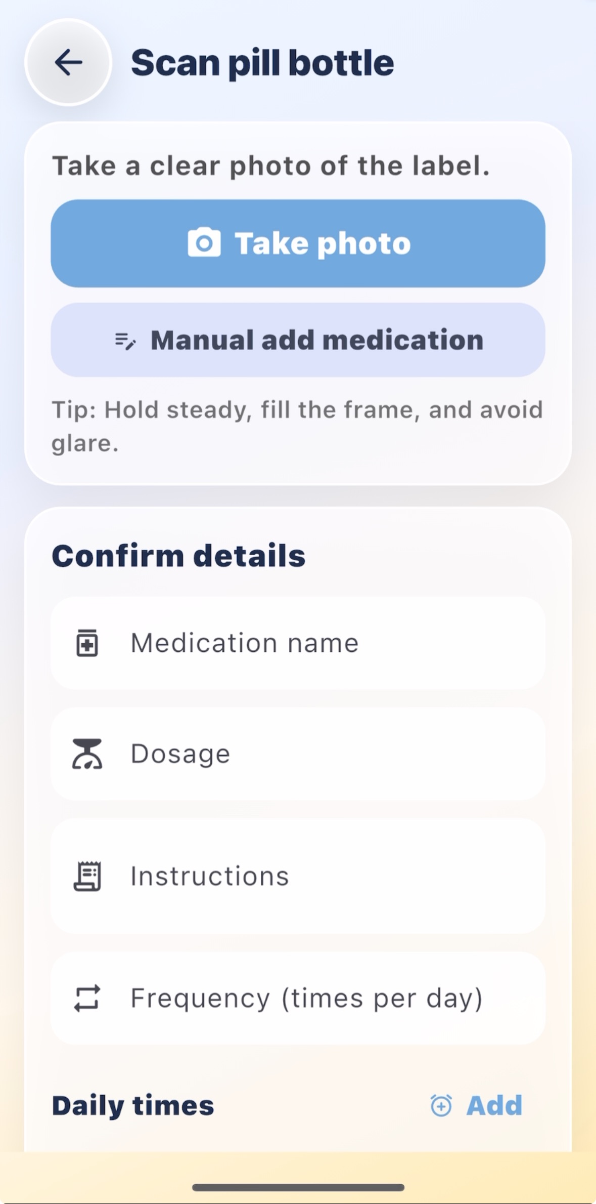 1. Scan your pills : Users can scan the label of prescription bill bottles to automate reminders based on the dosage information. For medication without a prescription label, users can manually enter their medication and reminder times.