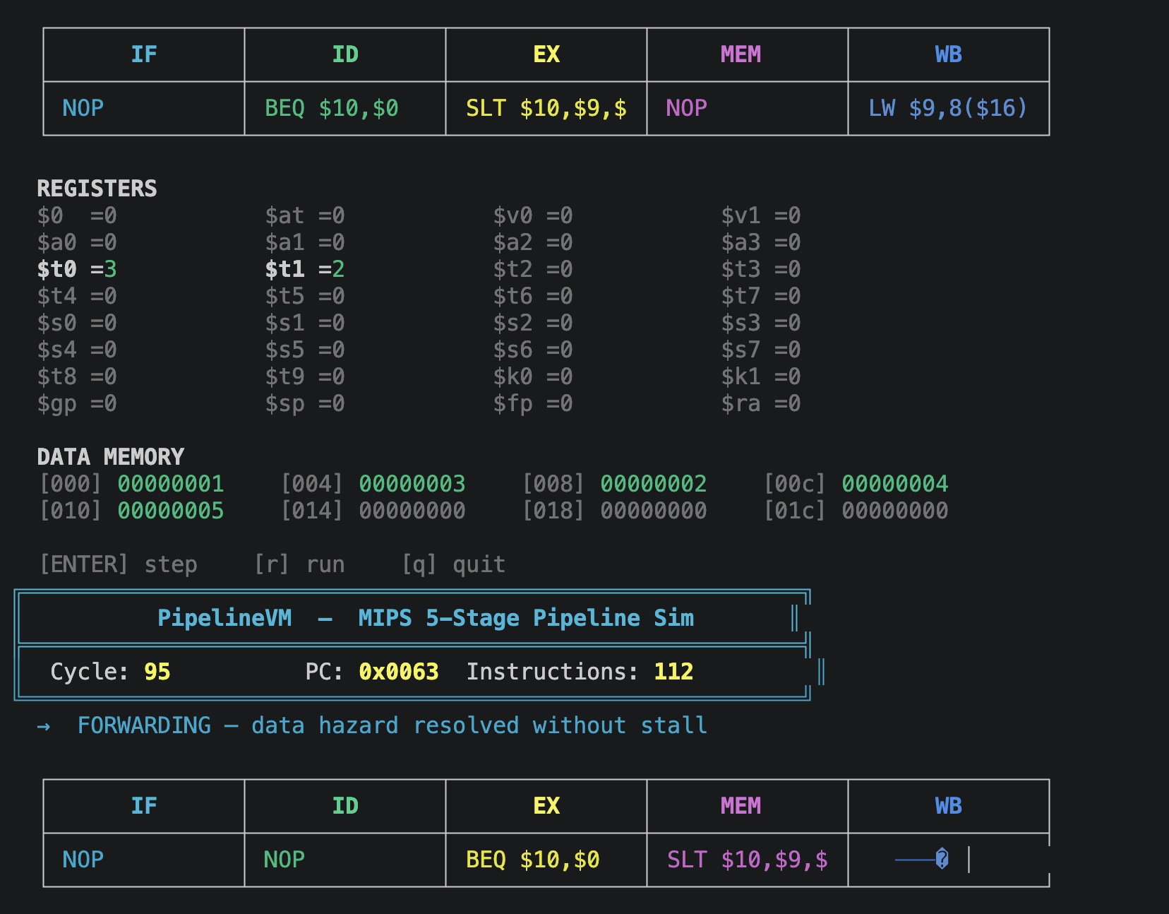 Getting the forwarding paths right. It sounds simple — just pass a value forward a stage — but correctly prioritizing EX/MEM over MEM/WB, handling the case where both paths fire simultaneously, and making sure forwarding never happens across a stall boundary required careful reasoning about every possible instruction sequence. When the bubble sort finally produced [1, 2, 3, 4, 5] in data memory after 10 hours of debugging, that was a real moment.