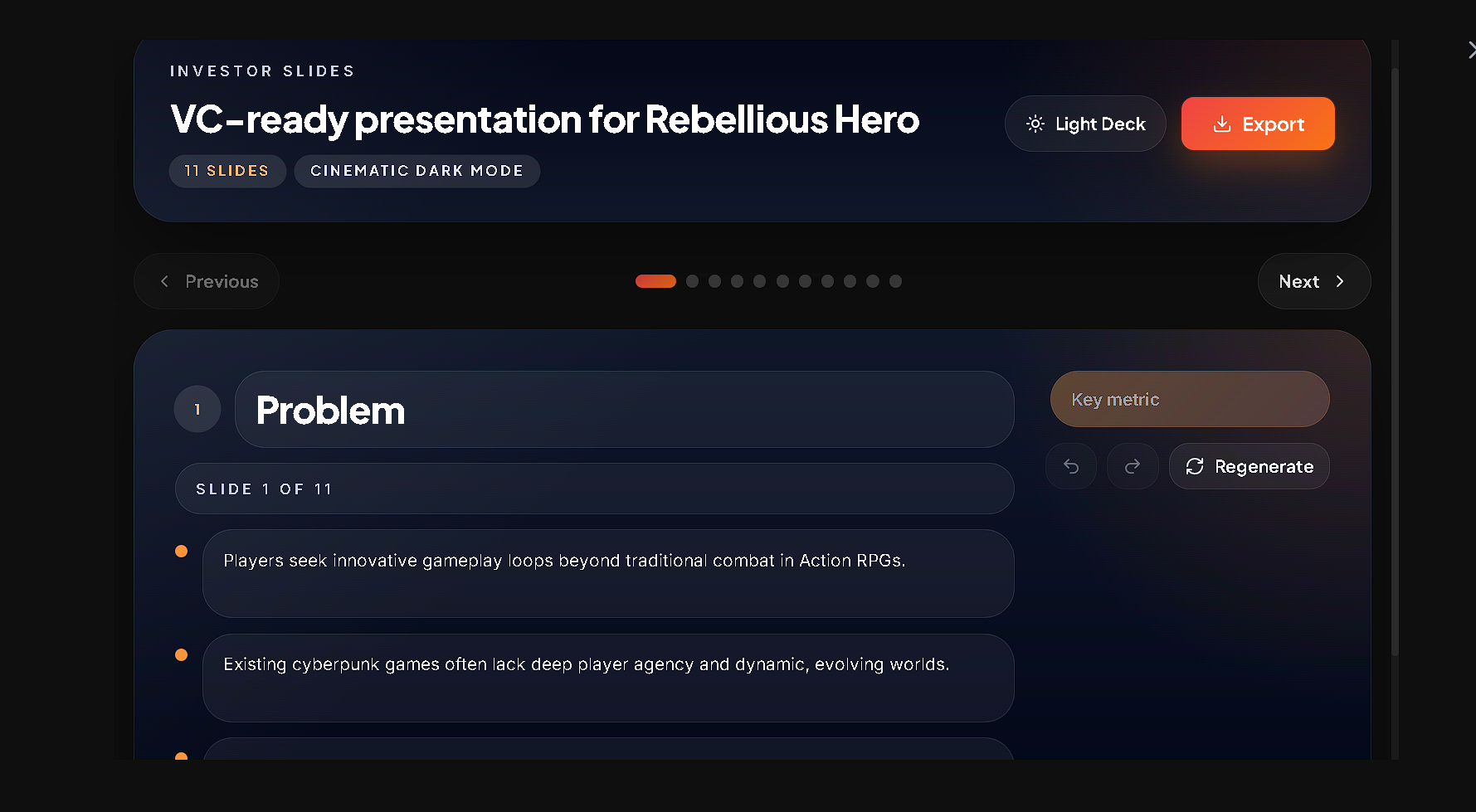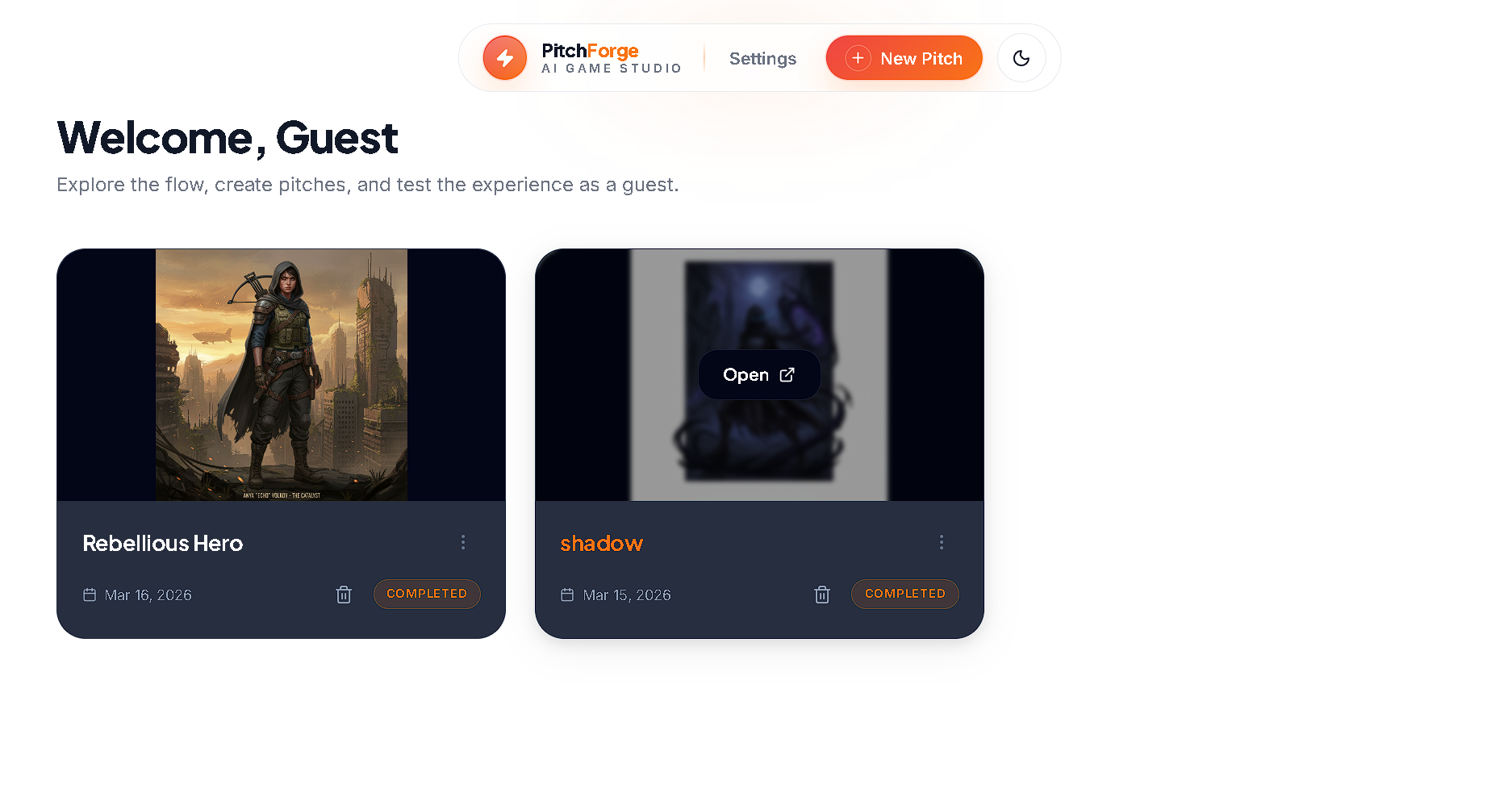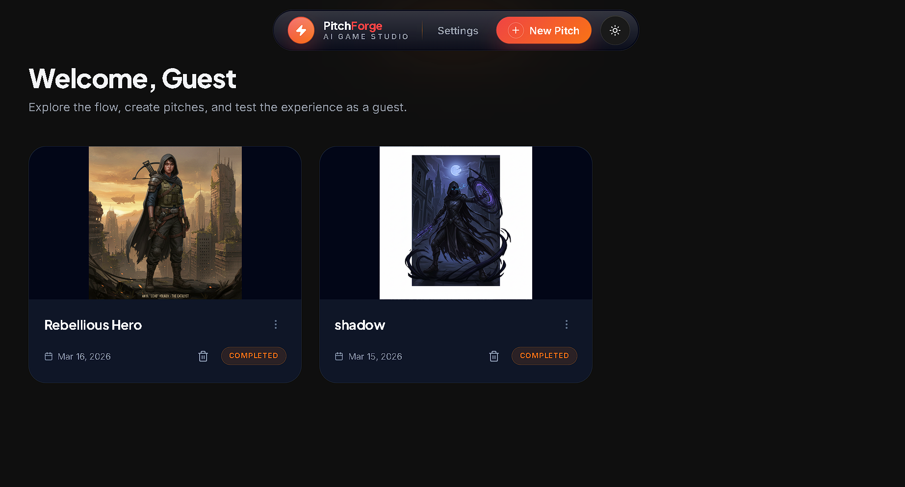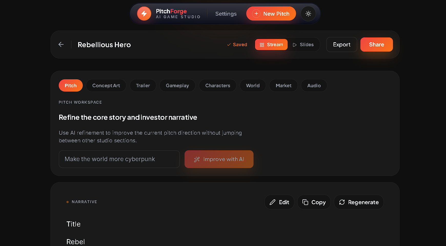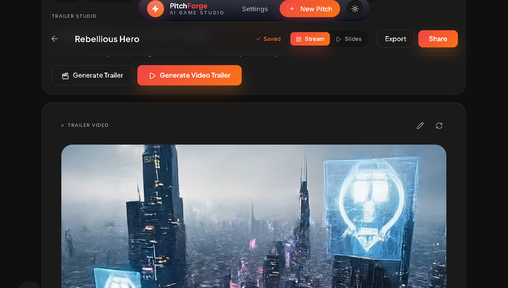 Our next step is to expand PitchForge into a full AI pre-production studio for game development. Future features will include character design tools, gameplay system visualizers, trailer generators, collaborative editing, and exportable pitch decks. Our goal is to help developers move from idea to production-ready concept faster than ever before.