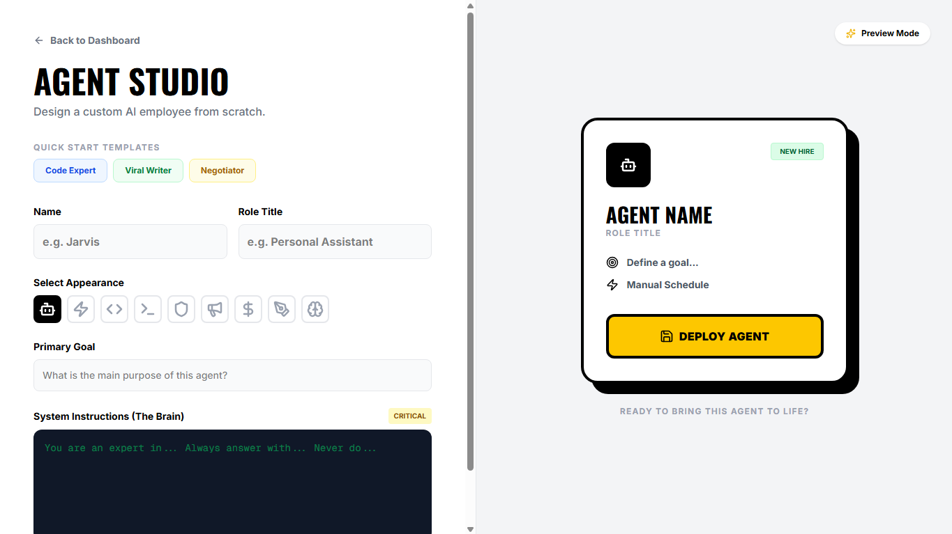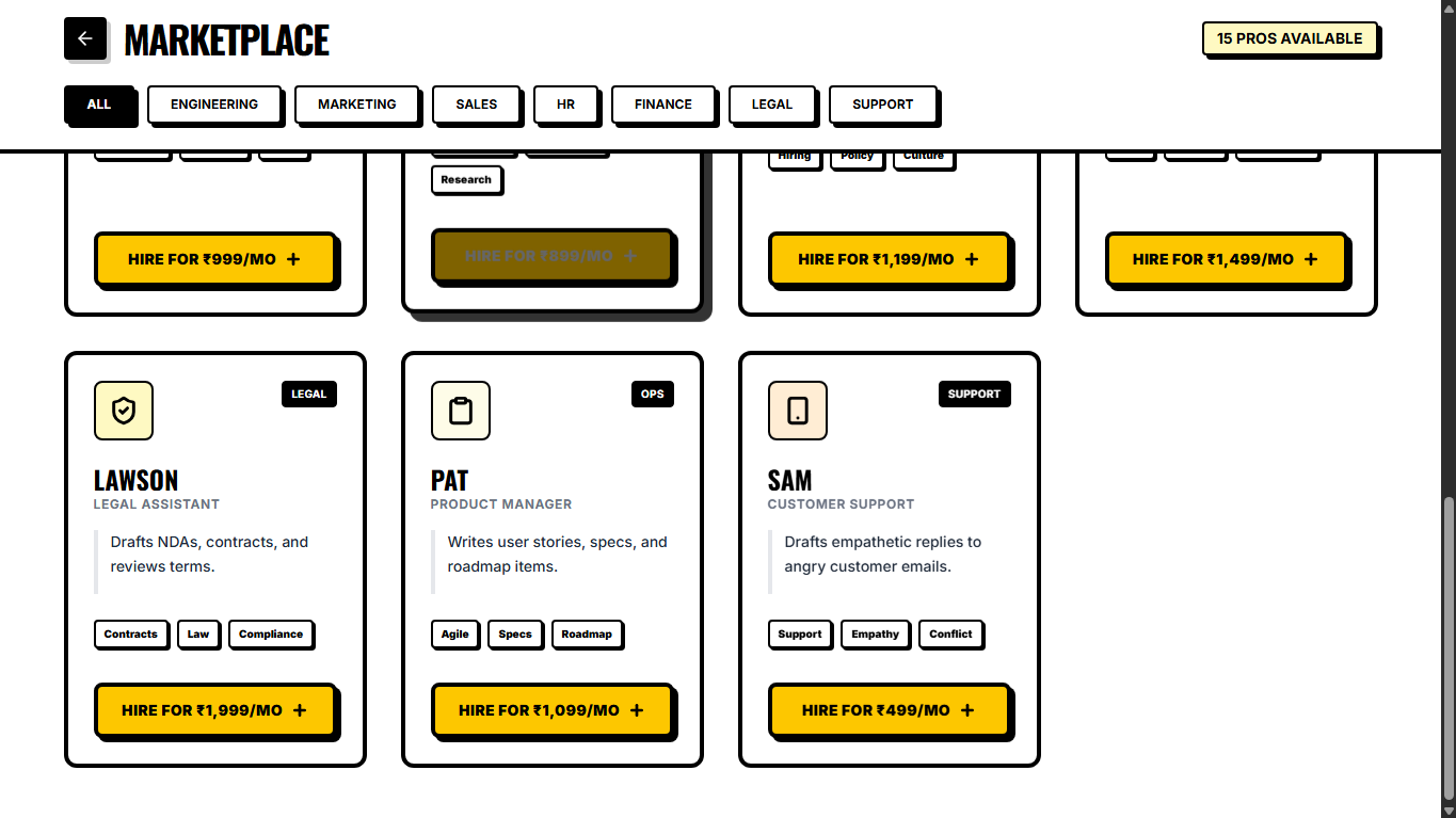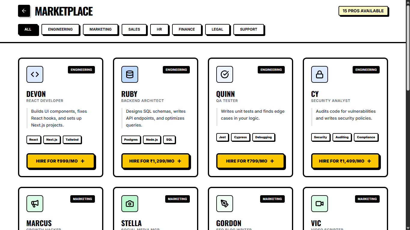 For startups and small businesses, hiring specialized talent is often the biggest bottleneck. Finding the right developer, architect, or marketer takes time, and full-time salaries aren't always feasible for early-stage ventures. We realized that with the rapid advancement of LLMs, businesses shouldn't just be buying software — they should be "hiring" autonomous AI agents. We wanted to build a platform where finding the perfect AI employee for a specific role is as easy as adding a subscription to your cart.