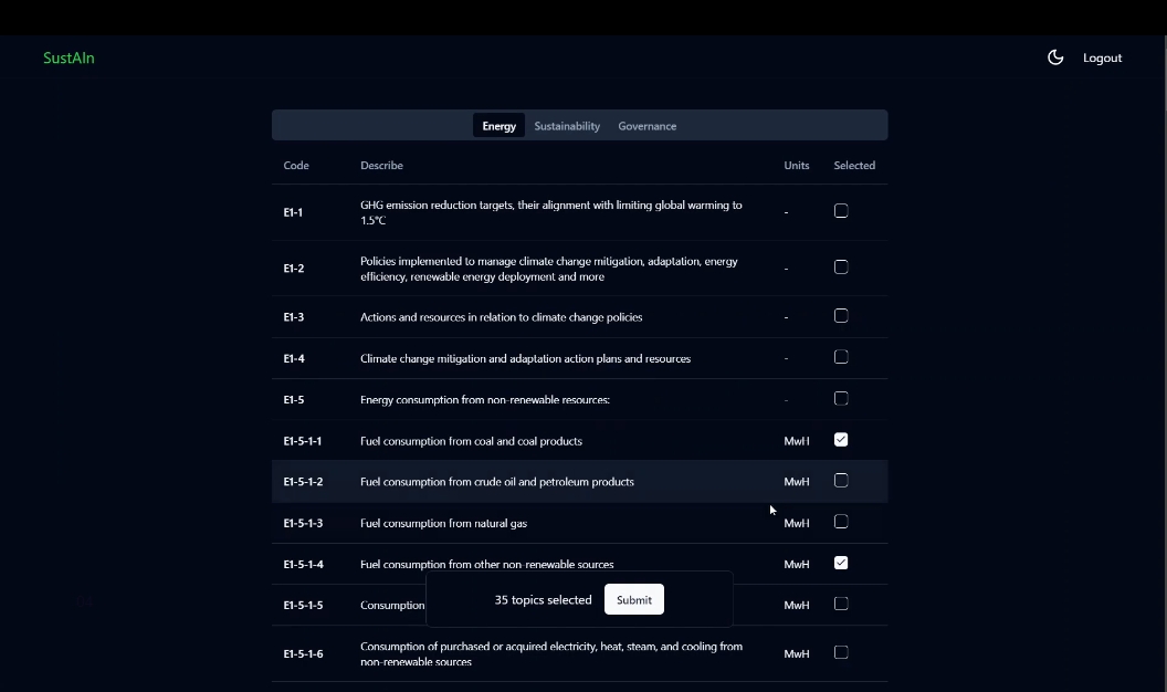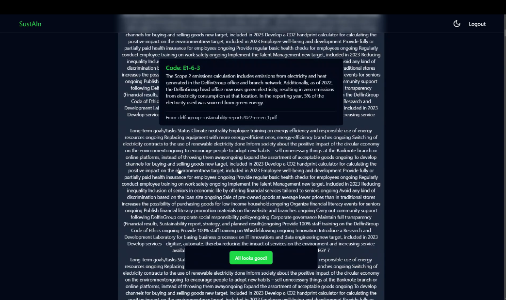 We offer a solution which offers a convenient way on how to create this report in minutes. The person just has to upload company's documents on self-hosted system, then choose what question he wants to be answered in the report and then AI takes the lead by answering all the questions instead of the user. And ultimately generates a complete ESG report which can be handed to the EU. Main functionality: