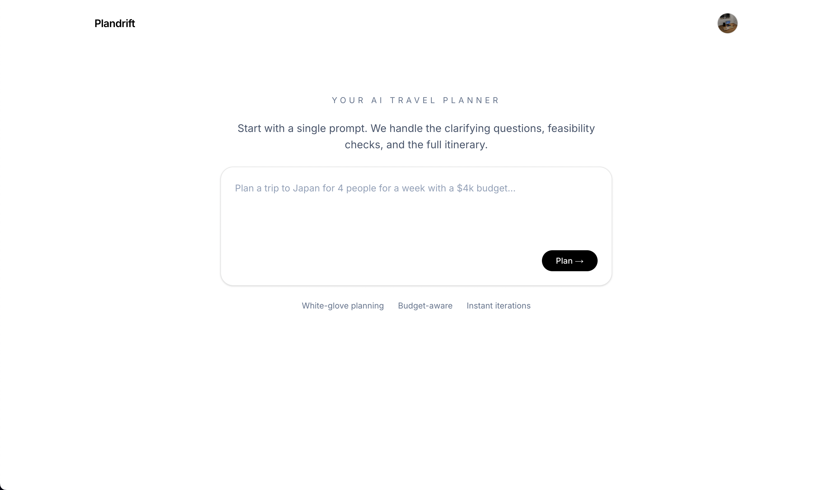 Plandrift is an AI-powered trip planning engine that focuses on how a plan is created, not just the result.
