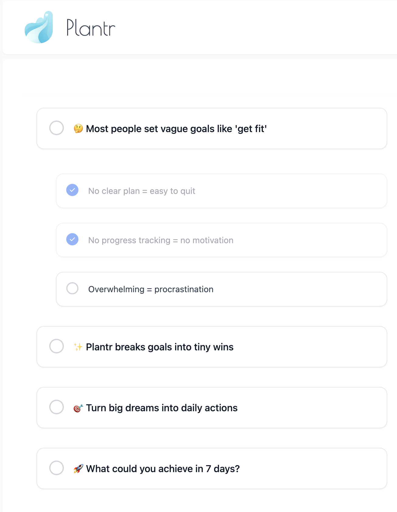 Why We Give Up (and How Plantr Helps) Ever felt that incredible rush when you set a big goal – maybe learning a new skill, getting fit, or starting a side hustle – only to see it fizzle out by February? You're definitely not alone. It turns out, most of us (like, 92%!) bail on our big ambitions pretty quickly. Why? Because those huge dreams just feel impossible. When you don't know where to even start, it's easy to get overwhelmed, lose your motivation, and just give up. That feeling, that common struggle, is exactly what sparked the idea for Plantr.