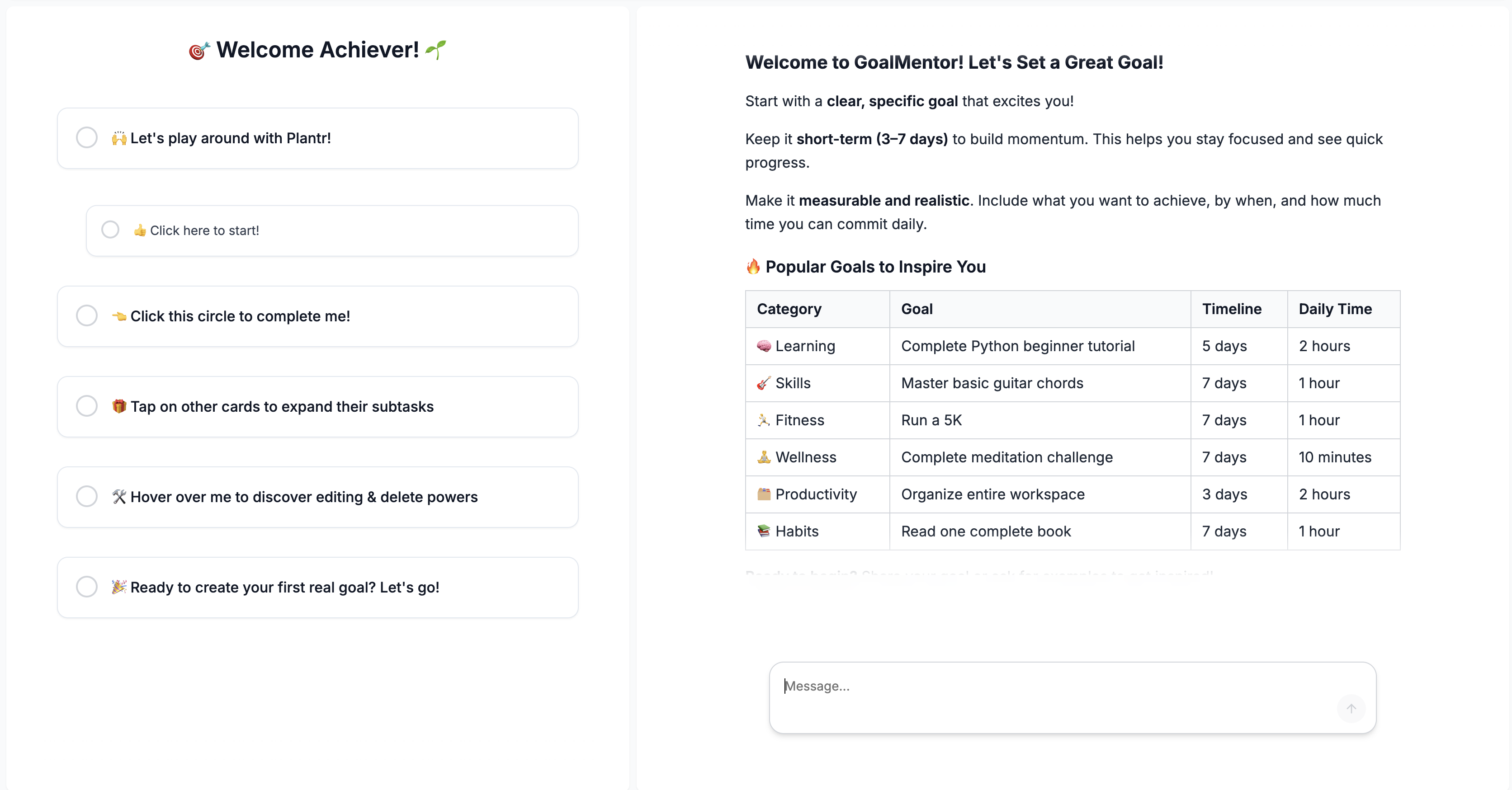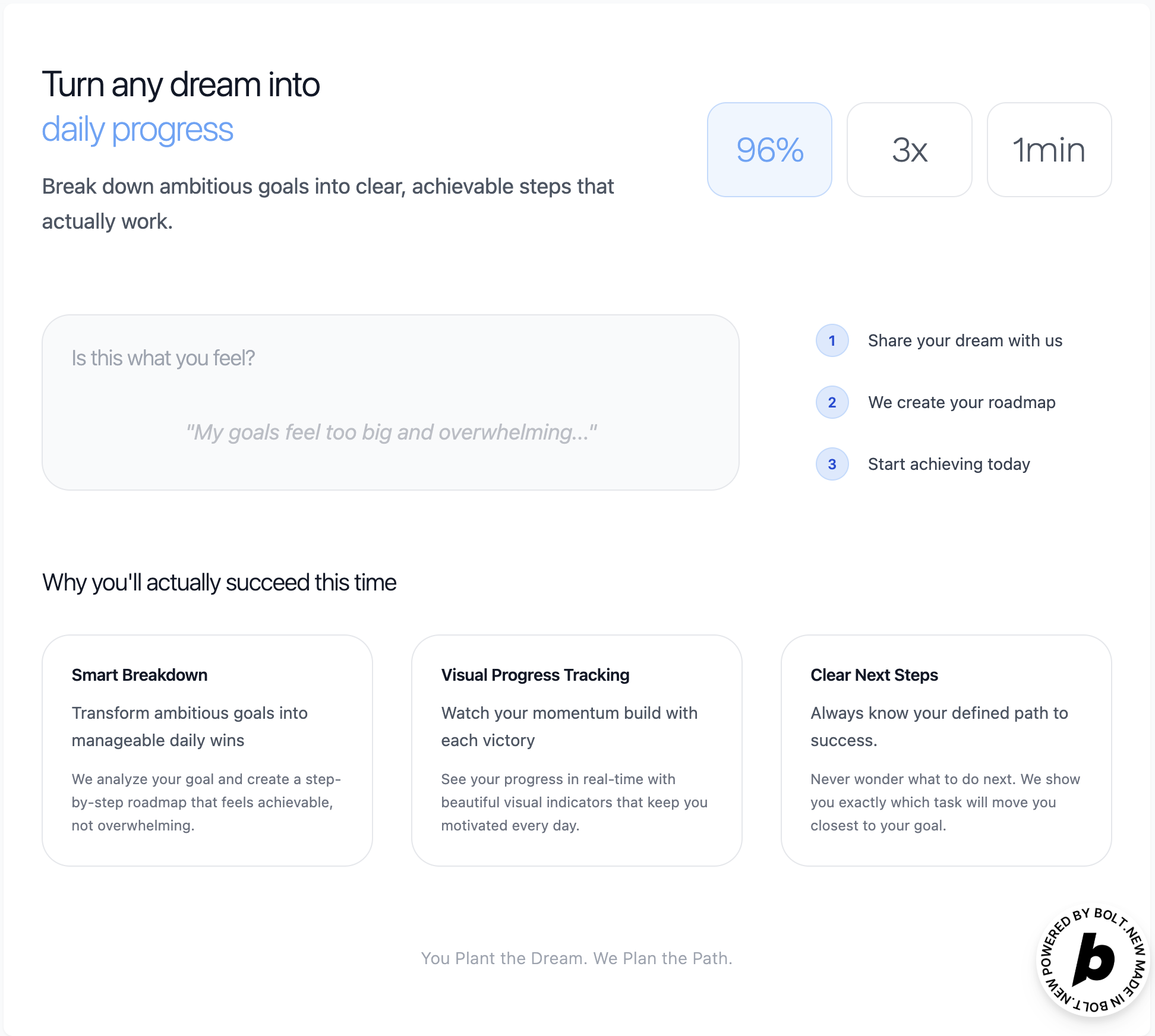 Your Personal Dream Coach Plantr is my way of tackling that problem head-on. It's a smart little app I built that takes any big dream you have and breaks it down into super clear, tiny daily steps. Think of it like this: you tell Plantr your goal in plain words, and it creates a personalized plan that feels totally doable, not scary. No more wondering what to do next. Plantr helps you take consistent action every day, turning those huge, daunting goals into satisfying little wins.